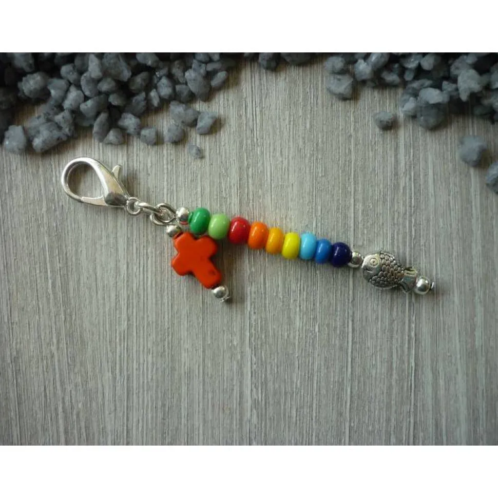 Ein Metallfisch, Metallperlen und bunte Rocailles ( Durchmesser ca 4,5mm ) sind auf eine Nietstift aufgereiht. Ebenso das Howlithkreuz ( Höhe ca 10mm ). Sie sind mit einer hellsilberfarbenen Metallöse an dem hellsilberfarbenen Karabiner ( ca 16 mm hoch ) befestigt. Die Gesamtlänge des Anhänger beträgt ca 7 cm.