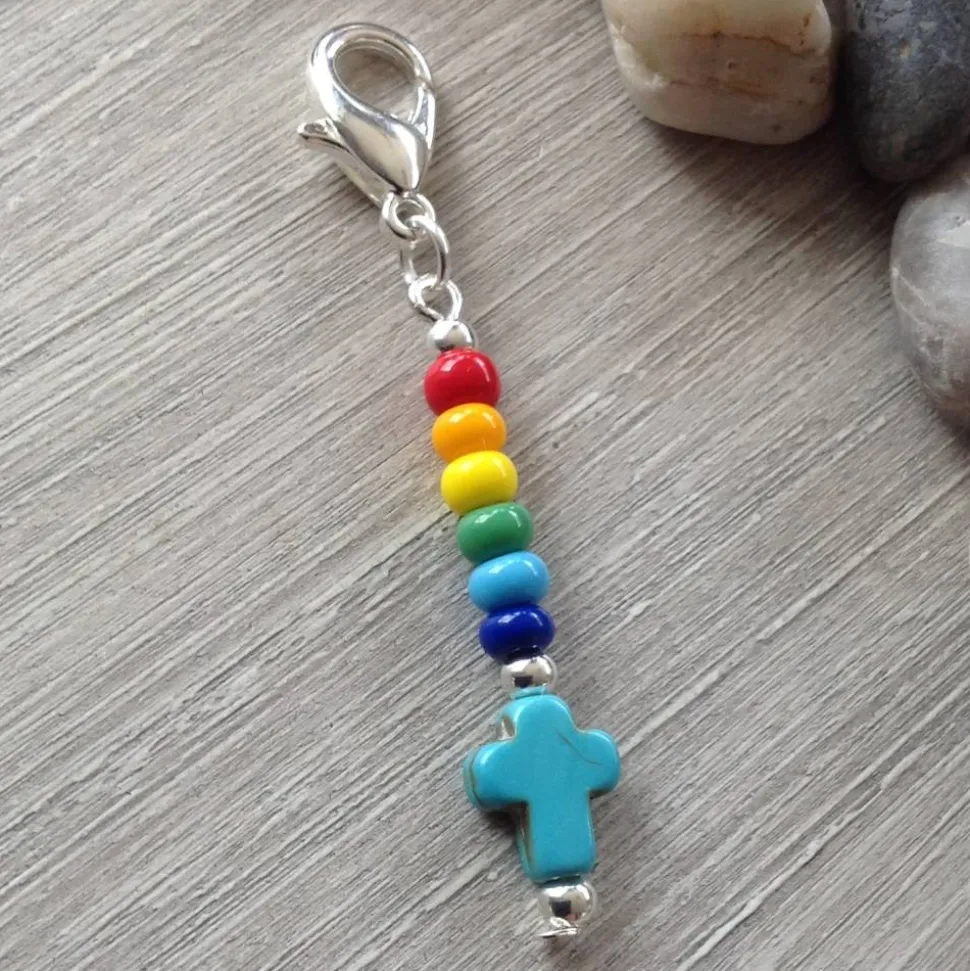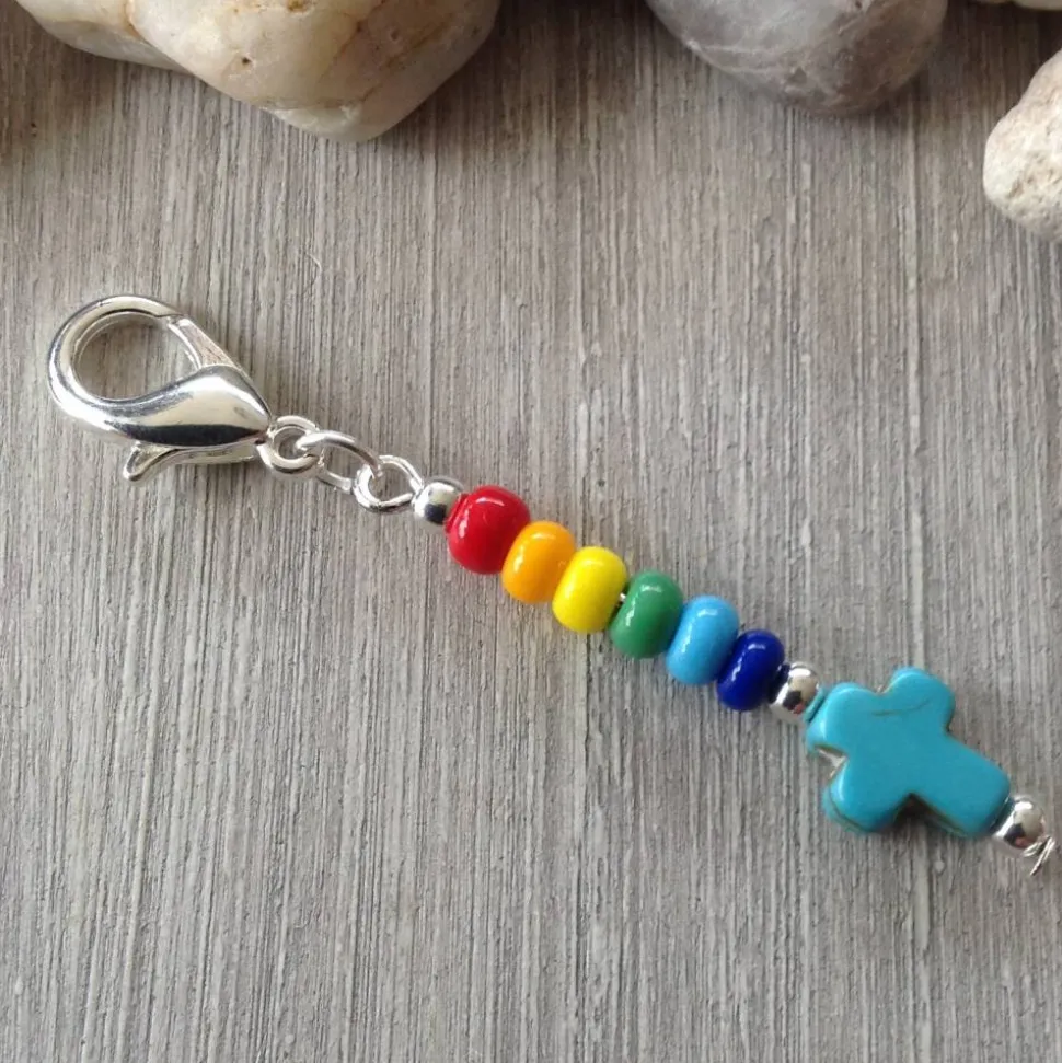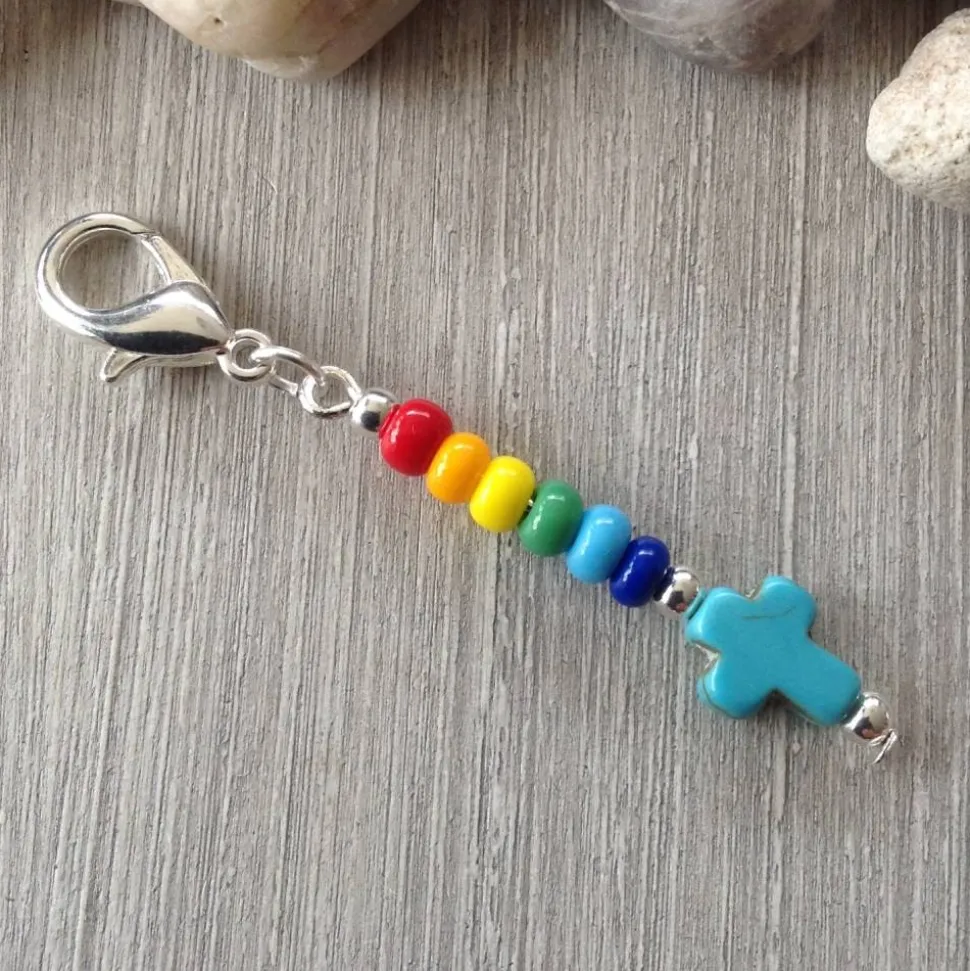 Ein türkisfarbenes Howlithkreuz ( 8mm breit & 10 mm hoch ) Metallperlen und bunte Rocailles ( Durchmesser 4,5mm ) sind auf einem Nietstift aufgereiht. Dieser ist mit einer Öse an dem dunkelsilbernen Karabiner ( ca 1,4 cm hoch ) befestigt. Die Gesamtlänge beträgt ca 5,6 cm.
