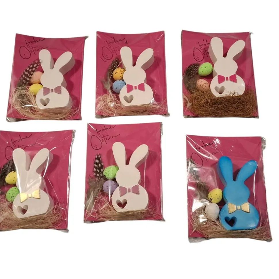 Verschenke zu Ostern eine besondere Aufmerksamkeit: Der handgefertigte Osterhase aus Raysin ist ein charmantes Mitbringsel und kleiner Ostergruß, der garantiert Freude bereitet. Du erhältst ihn in einer Tüte mit einem kleinen Nest aus Jutefasern, ergänzt durch zwei kleine Schaumstoffeier sowie eine echte Vogelfeder.