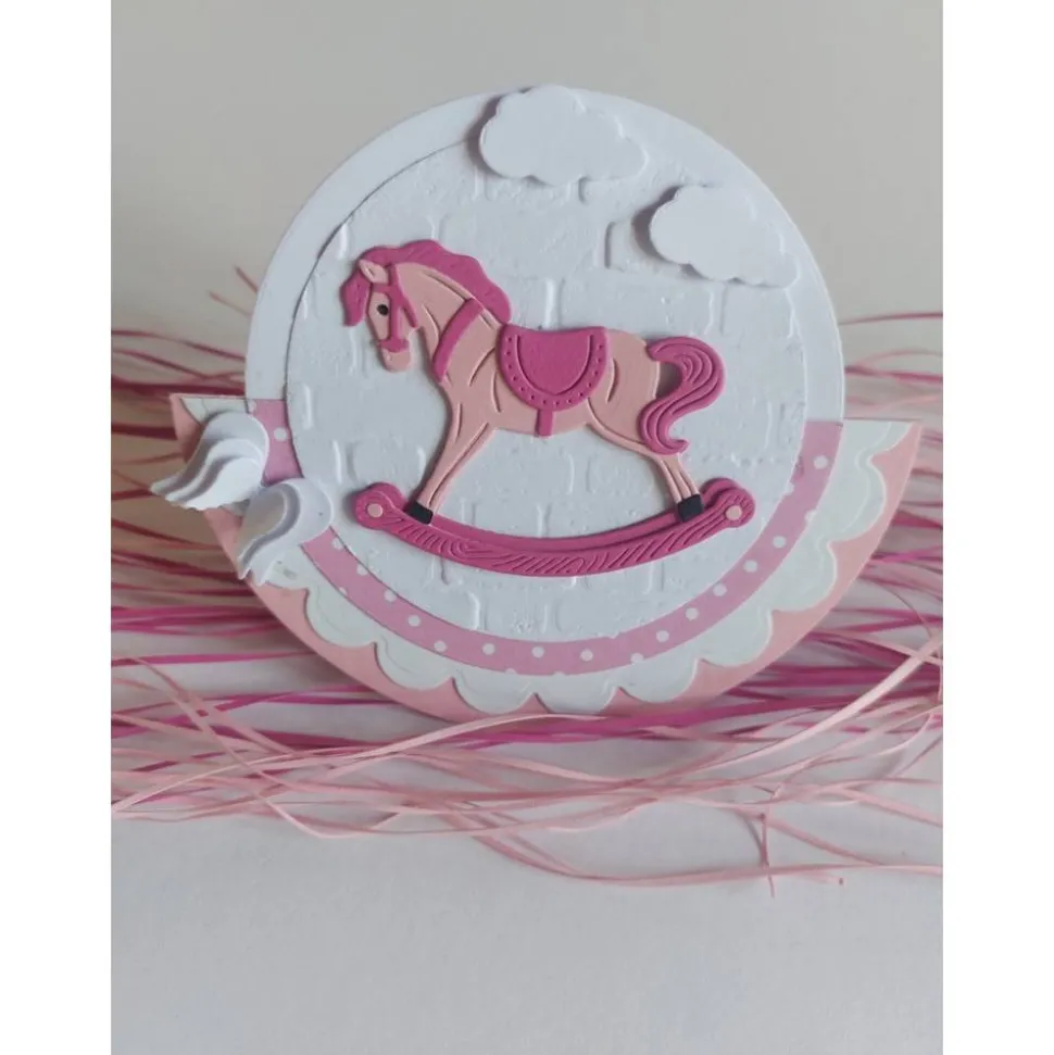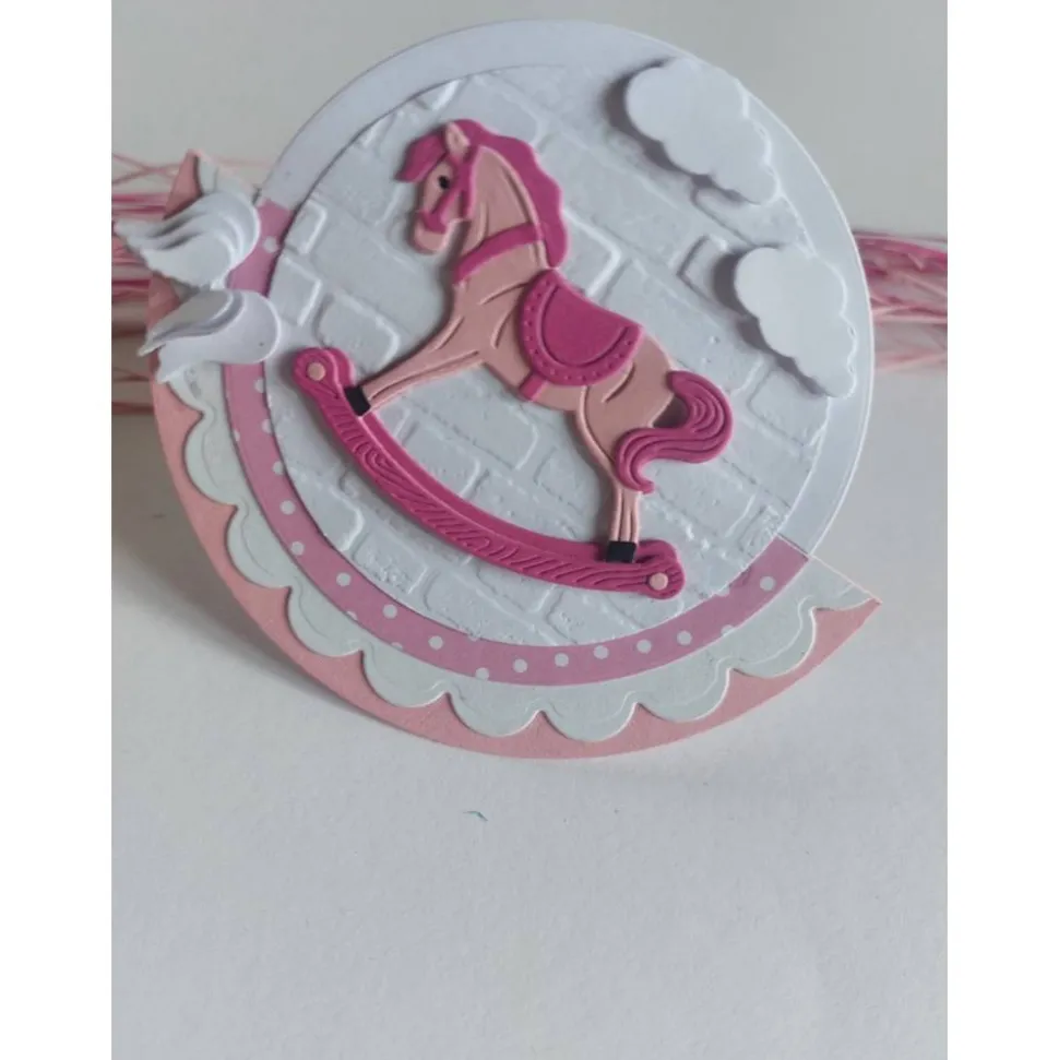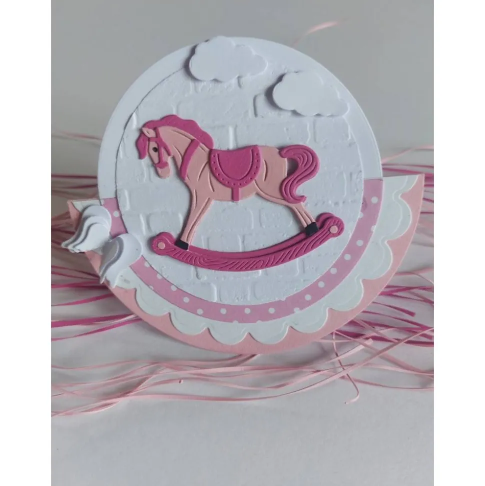 Mit einem Schaukelpferd das ich in mehreren Lagen zusammen gesetzt habe, vor einem geprägtem Mauerhintergrund, Wolken und Flügeln. Innen kann der Einladungstext selbst geschrieben oder gegen Aufpreis von mir gedruckt werden.