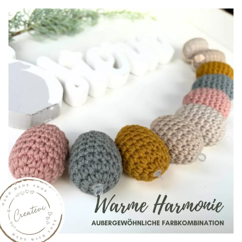 Die harmonische Farbzusammenstellung „Warme Harmonie“ greift sanfte Natur- und Frühlingstöne auf. Patina, Natur, Elfenbein, Senf und Blush sind jeweils zweimal enthalten und erinnern an erste Sonnenstrahlen, blühende Zweige und liebevoll gefüllte Osternester. Dadurch lassen sich die Häkeleier mühelos mit moderner, skandinavischer oder klassischer Osterdeko kombinieren.