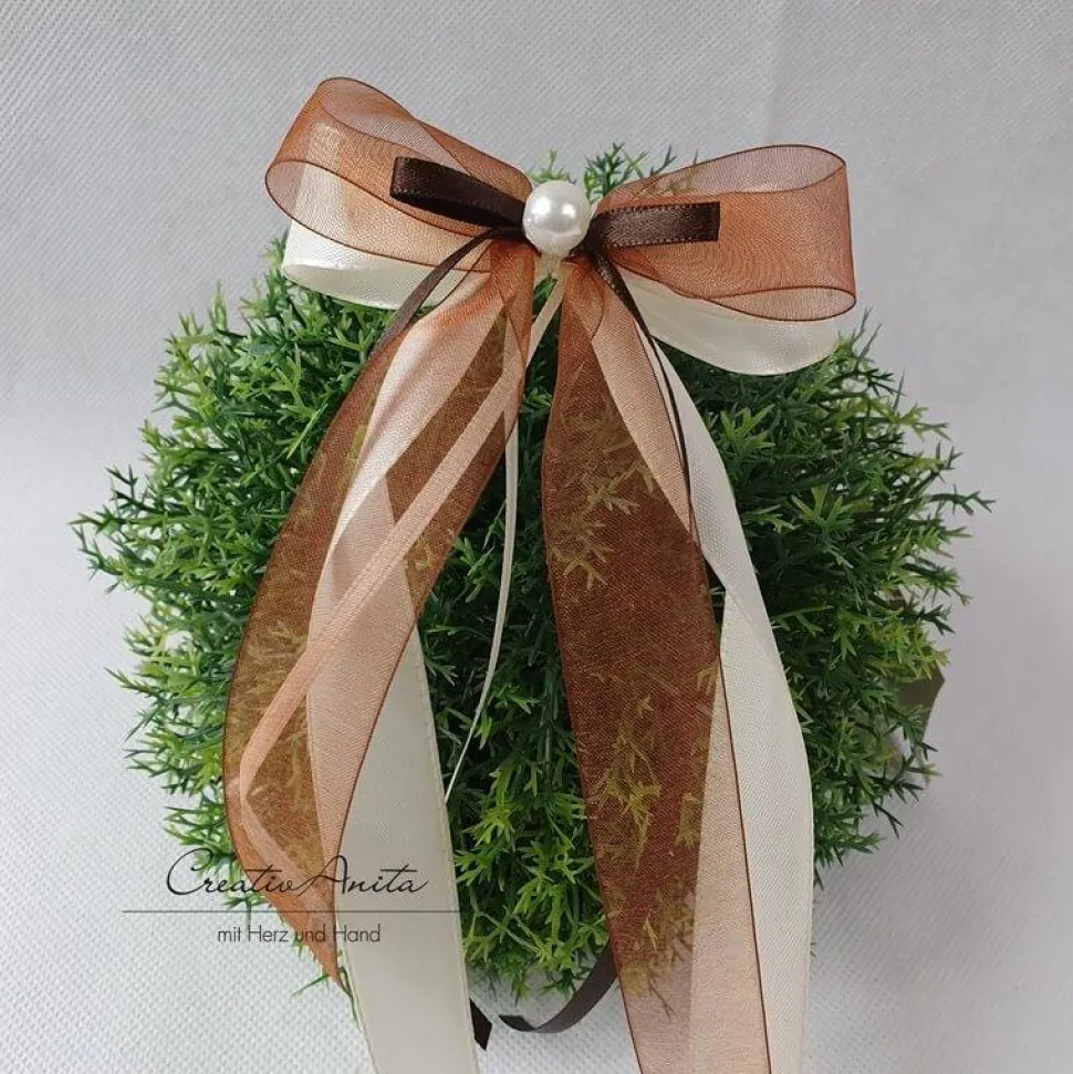 Zur Anfertigung der Autschleifen/Antennenschleifen werden 4 unterschiedliche, hochwertige Floristikbänder verwendet. (Satin, Chiffon, Taft – kann je nach Lieferantenangebot variieren!)