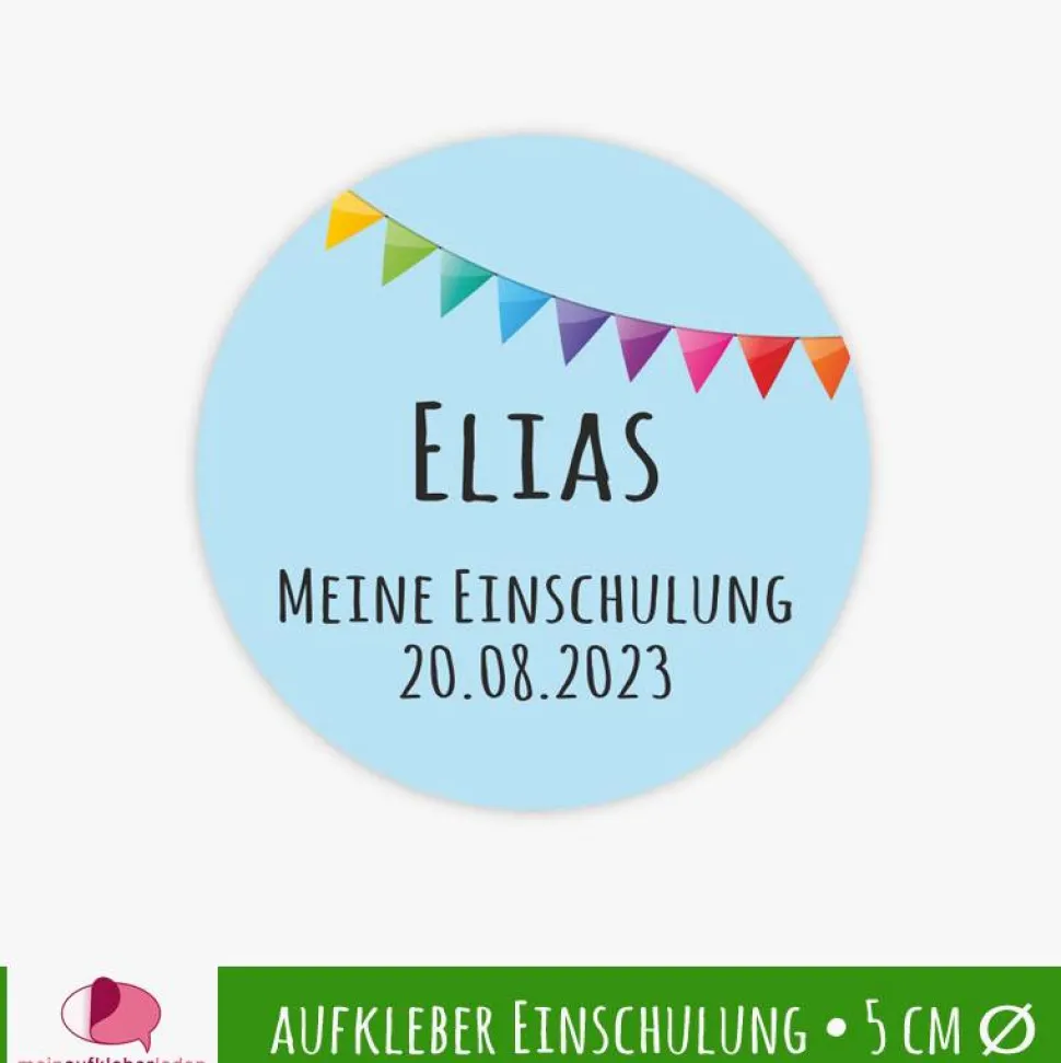 15 Aufkleber | Meine Einschulung hellblau – Bunte Wimpel  – personalisierbar | Schulanfang, Kinderparty