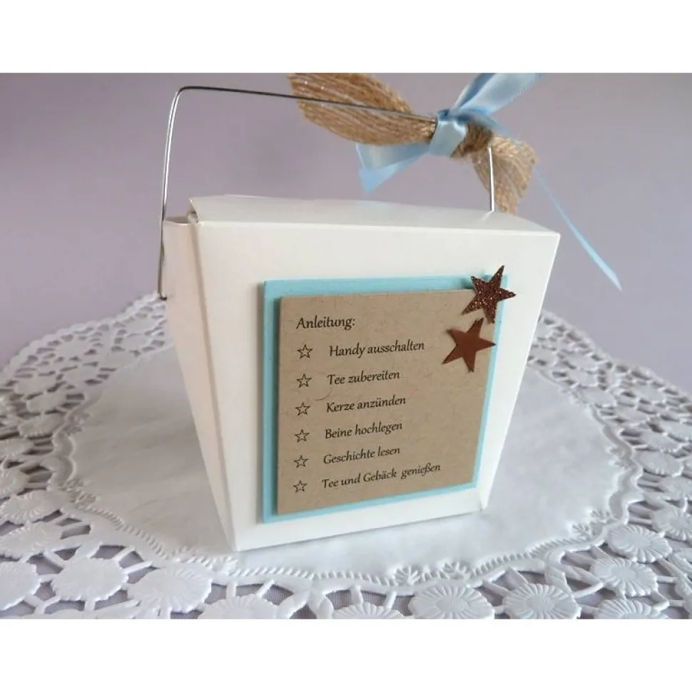 Tonkarton, Glitzerpapier, Juteband, Satinband, Kekse, weißer Kandiszucker, Teebeutel,