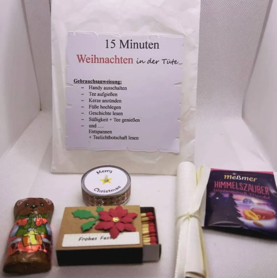 Inhalt: 1 Weihnachtsgeschichte, 1 Schokofigur (verschiedene Varianten möglich), 1 Weihnachtsteebeutel, 1 Teelicht Botschaft (verschiedene Varianten möglich), 1 bebastelten Streichholzschachtel ( verschiedene Designs möglich
