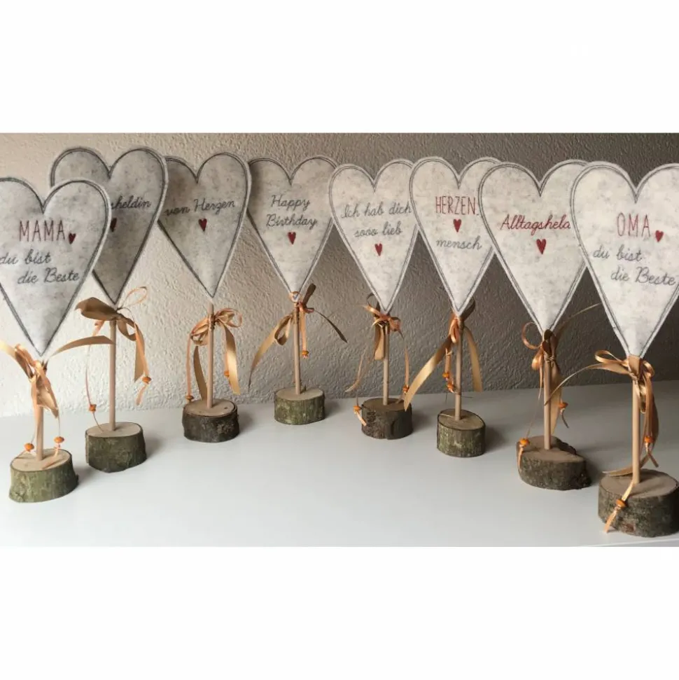 Die Herzen sind auf einem Standfuß aus Naturmaterial Holz aufgesteckt, die Höhe und das Aussehen des Ständers (Baumscheibe) können variieren.