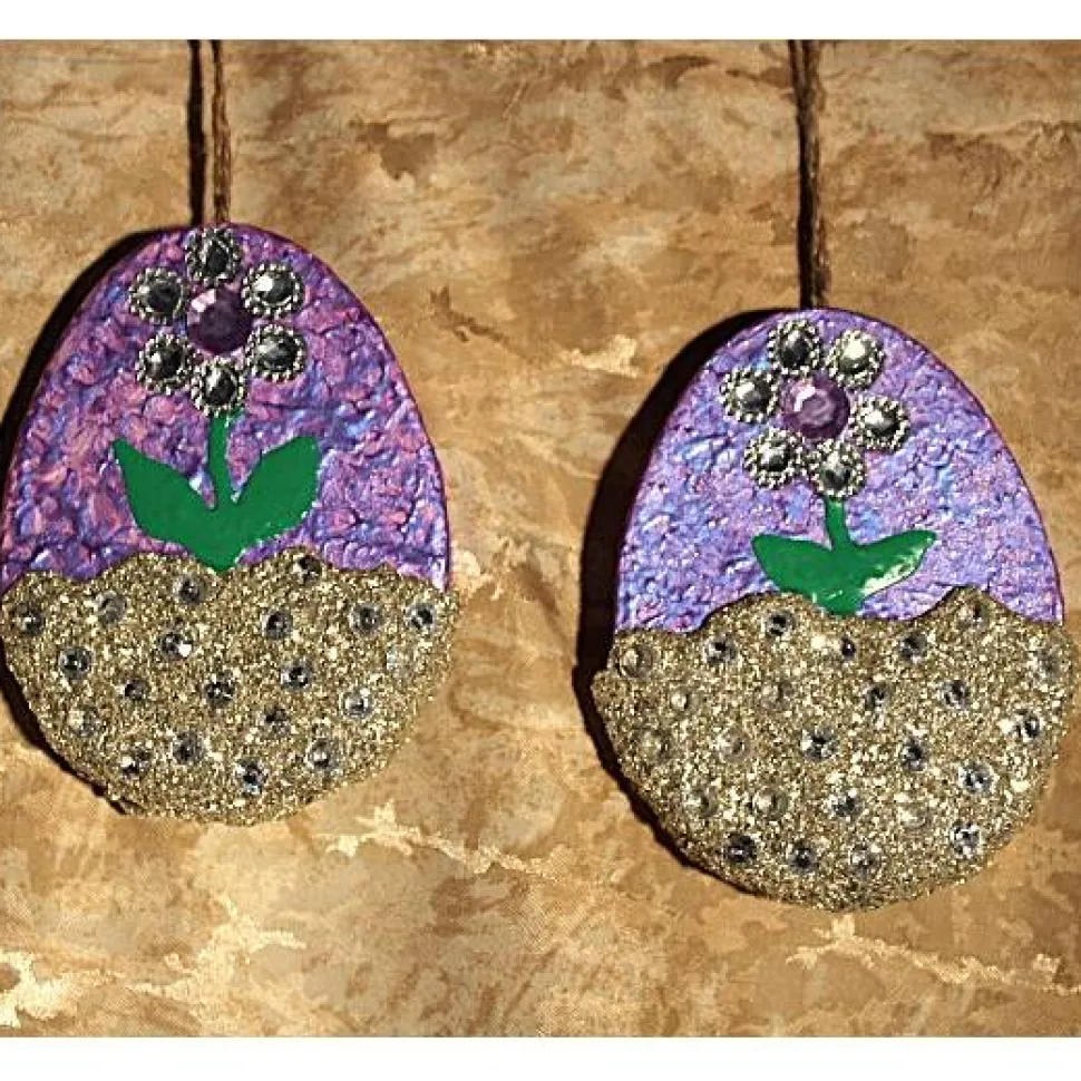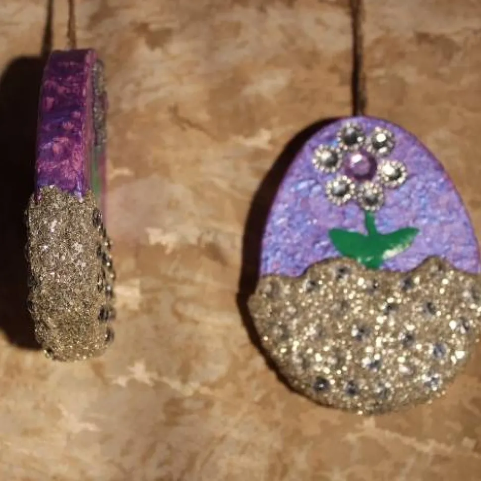 Zwei kleine, abstrakte Gestaltungen in den Farben Lila, Grün und Silber. Die kleinen flachen Eier sind beidseitig gestaltet und mit herrlich schillernden Glitzersteinen und Glitter beklebt.