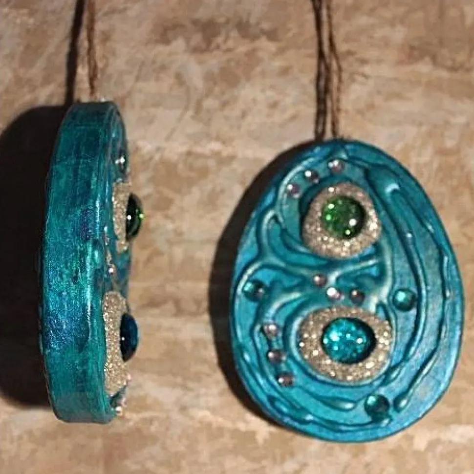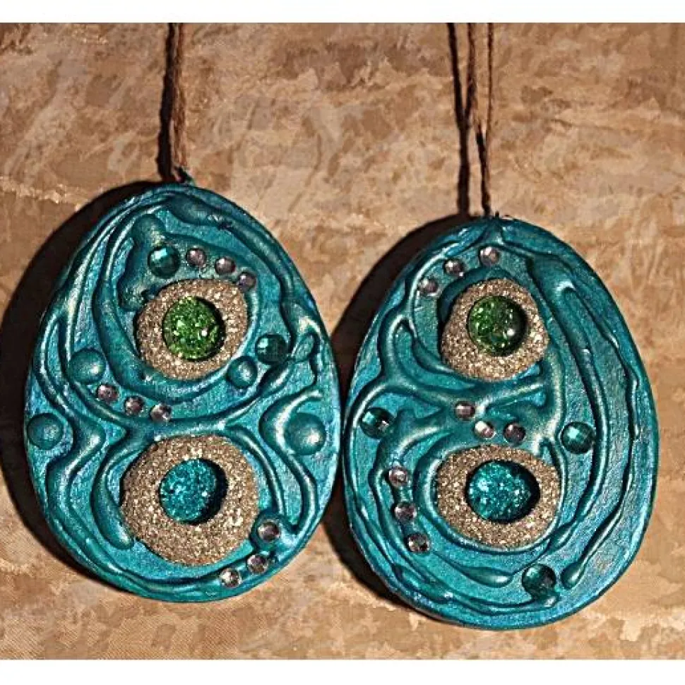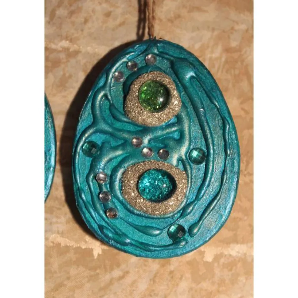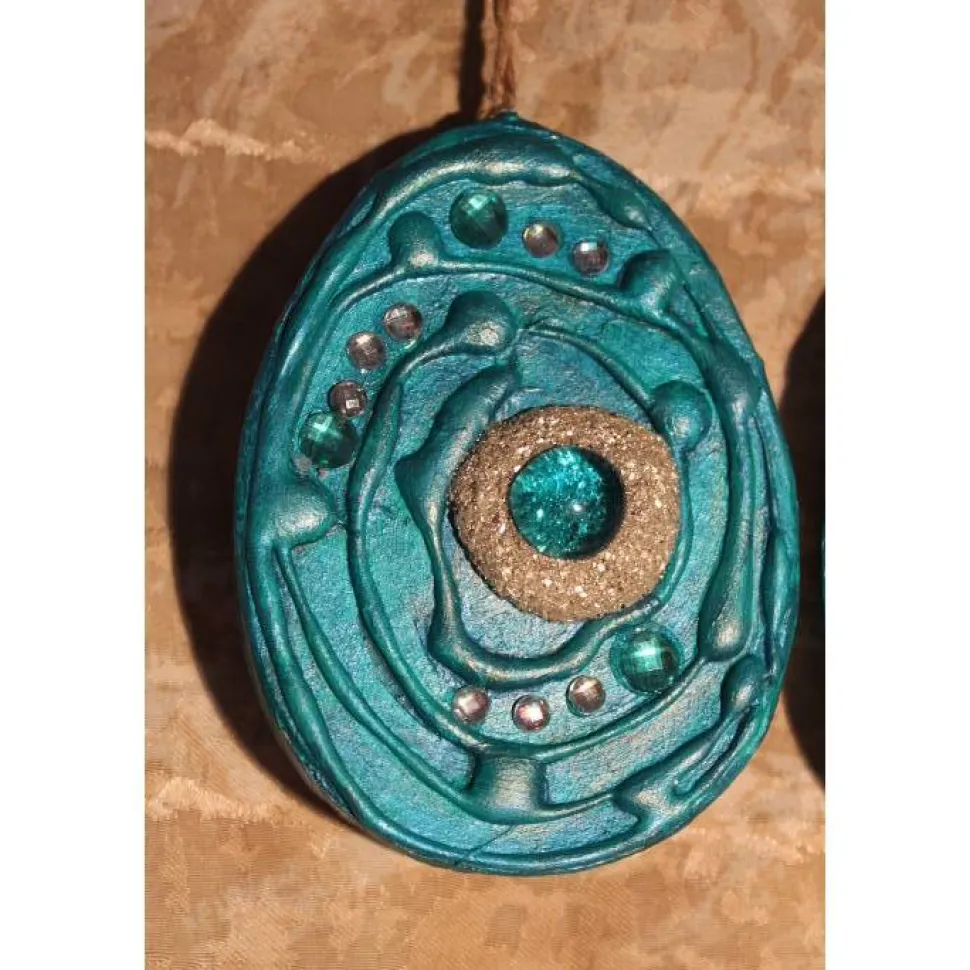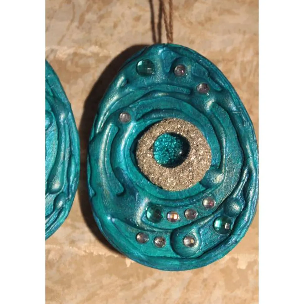 Zwei kleine, abstrakte Gestaltungen in den Farben Grüntürkis, Blau und Silber. Die kleinen flachen Eier sind beidseitig gestaltet und mit herrlich schillernden Glitzersteinen, Glitter und Glasnuggets beklebt.