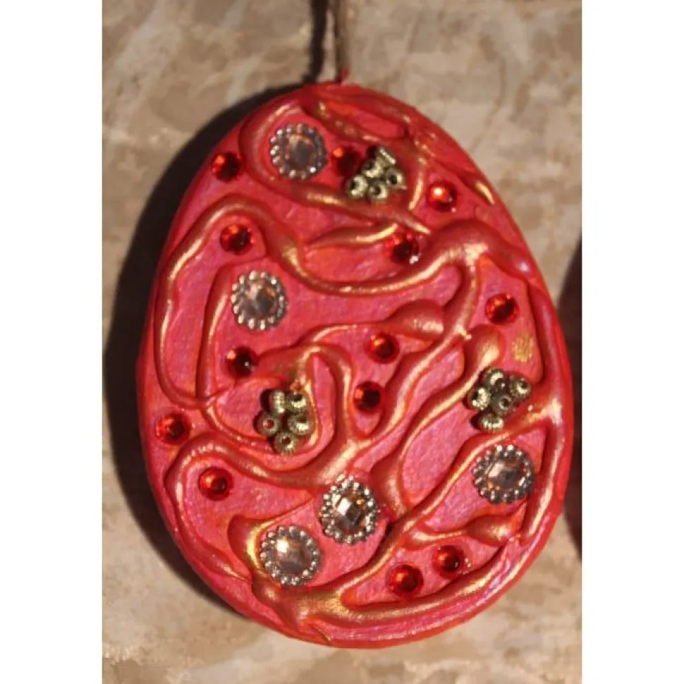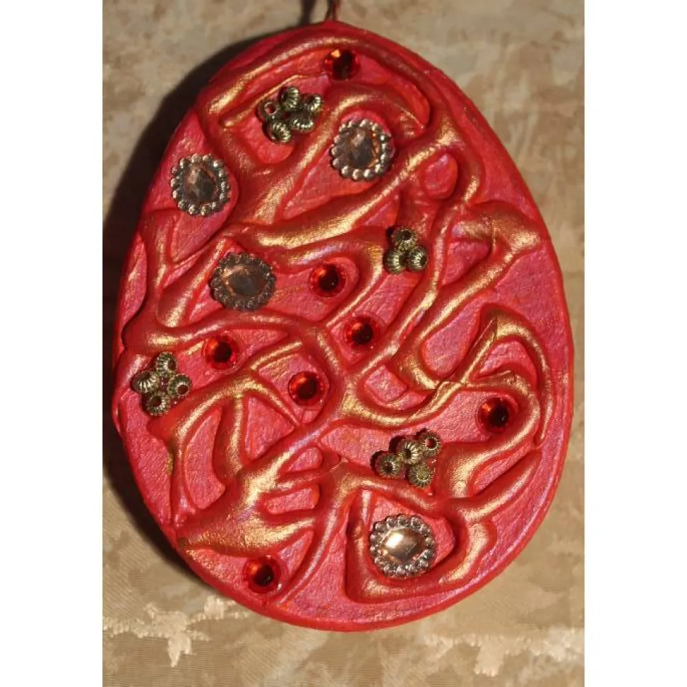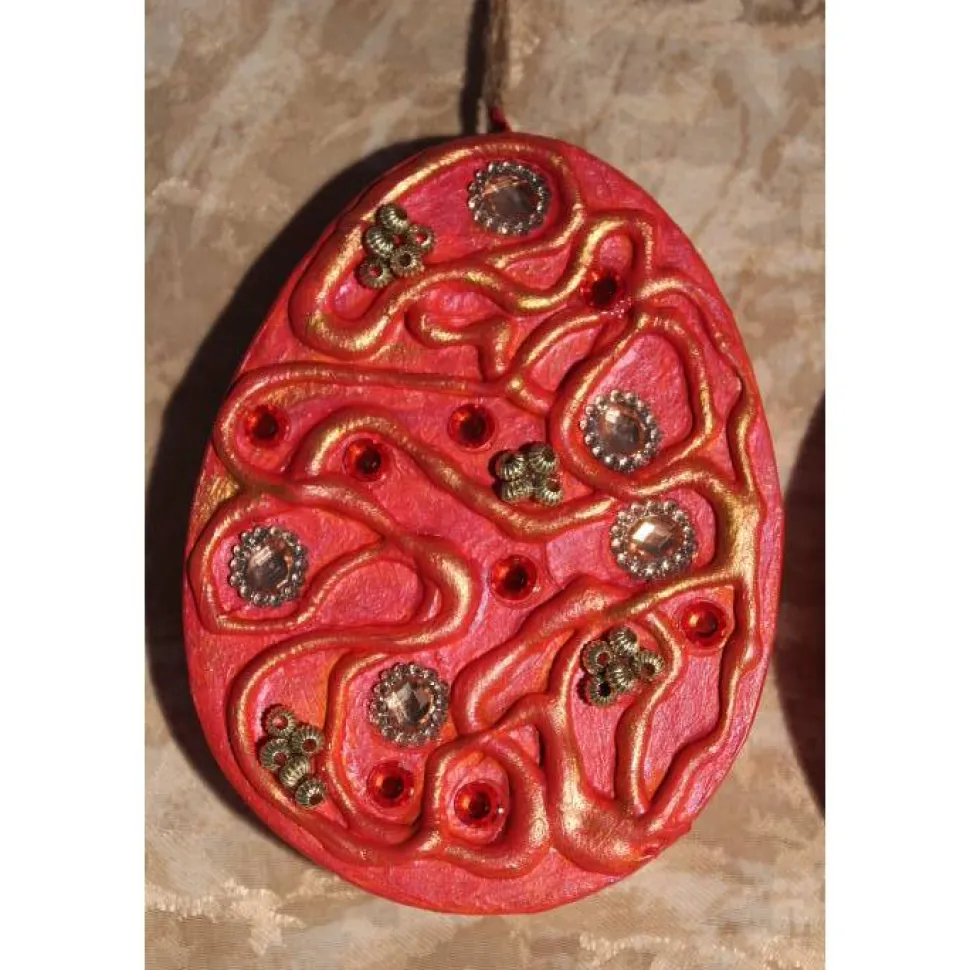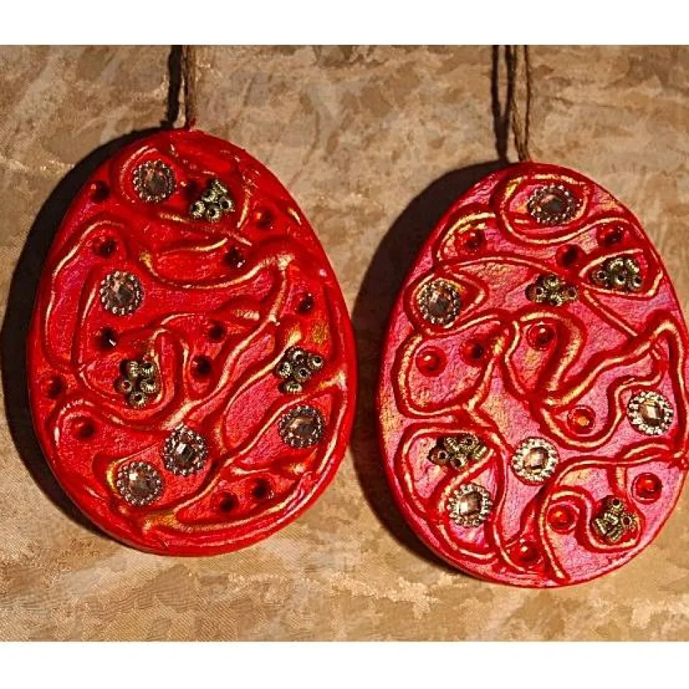 Zwei kleine, abstrakte Gestaltungen in den Farben Rot und Gold. Die kleinen flachen Eier sind beidseitig gestaltet und mit herrlich schillernden Glitzersteinen beklebt.