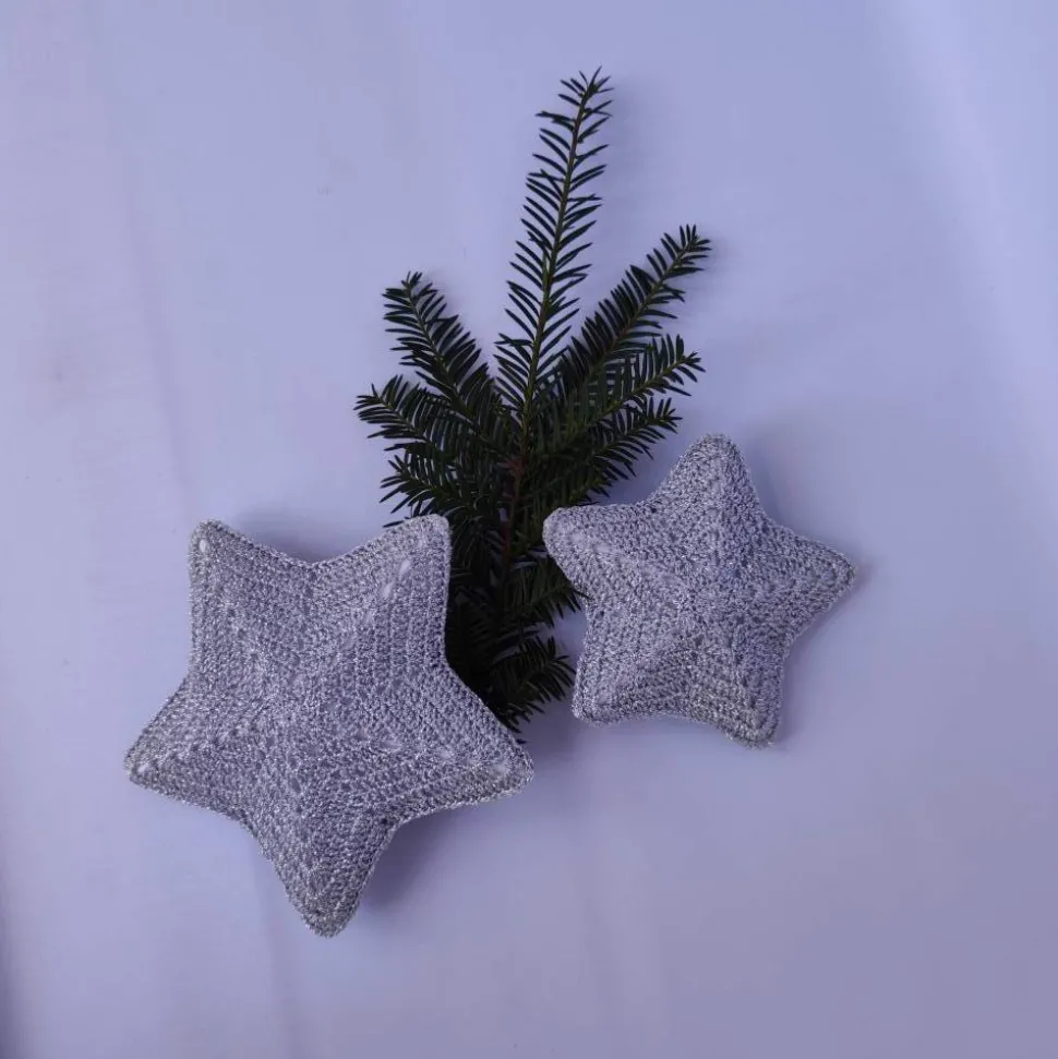 2 unterschiedlich große StyroporSterne ( ca. 14 und 20 cm) wurden für diese weihnachtliche Dekoration mit silberfarbenen Garn umhäkelt