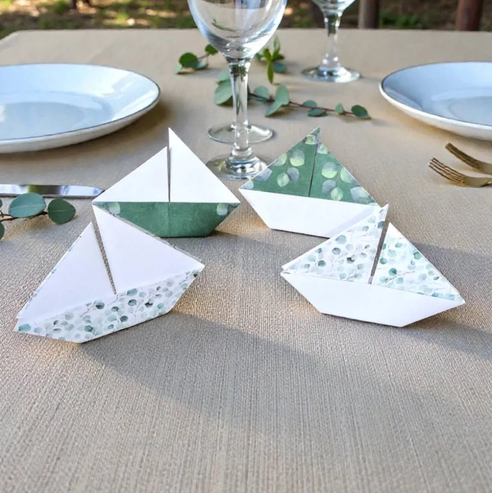 Besondere Qualität: Die Boote sind nur gefaltet, nicht geklebt, und können nach der Feier umweltfreundlich in der Papiertonne entsorgt werden. Durch die spezielle Falttechnik stehen die Boote aufrecht – ein echter Hingucker auf jedem Tisch.