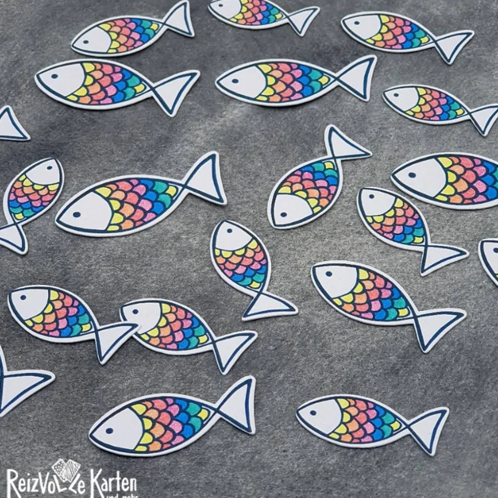 Verleihe deiner Festtafel zur Kommunion oder anderen Anlässen eine besondere Note mit den 20 Streuteilen als Deko mit einem Fisch in Regenbogenfarben.
