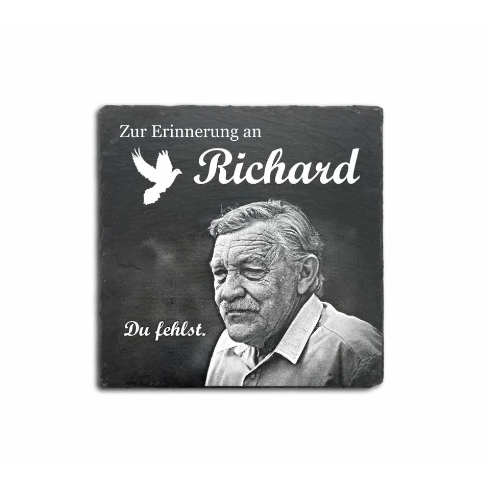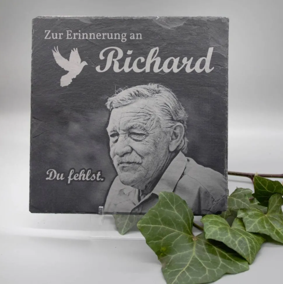 Schaffe eine bleibende Erinnerung mit einem individuellen Gedenkstein: Die 20 x 20 cm Schiefertafel inkl. Gravur ist die perfekte Wahl als persönlicher Grabschmuck. Jede Gedenktafel wird nach deinen Wünschen graviert – mit Foto, Wunschtext und auf Wunsch kleinen Symbolen. So gestaltest du eine einzigartige Grabtafel, die liebevoll an einen besonderen Menschen erinnert.