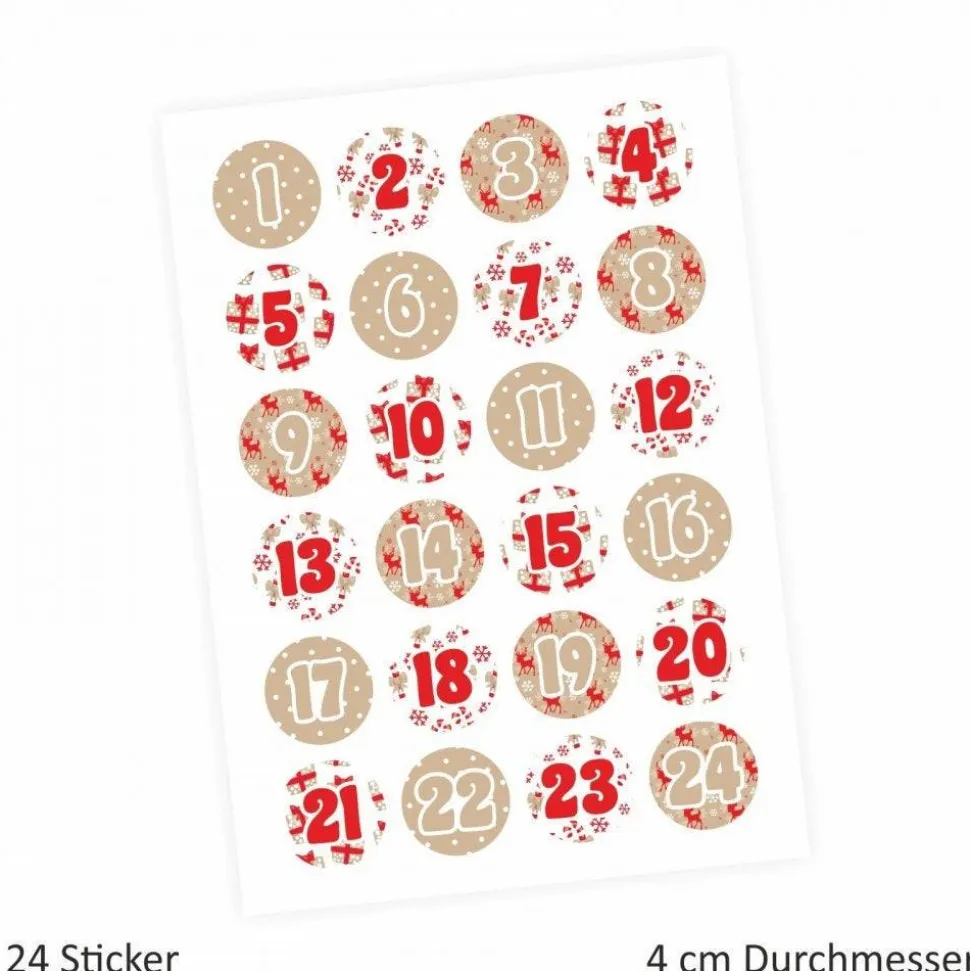 24 Adventskalender Zahlen Aufkleber ROT/BEIGE – rund 4 cm Ø – Sticker Weihnachten zum basteln dekorieren DIY