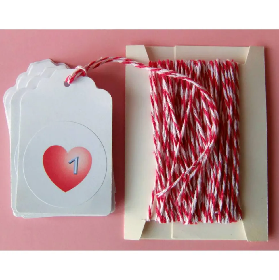 24 Anhänger weiß, per Hand gestanzt, tags sind gelocht, für Bändchen. Ca. 7,5m Bäckergarn in rot – weiss gibt es dazu! Die Länge kannst du selber bestimmen, es sind ca. 31cm pro Anhänger!