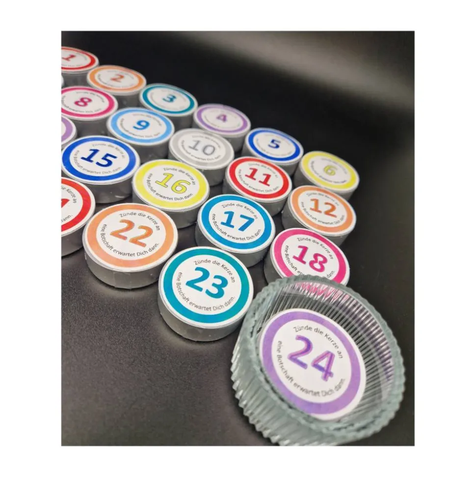 Entdecke 24 geheime Botschaften in 24 Teelichtern – die perfekte Adventskalender Füllung oder Geschenkidee für die Vorweihnachtszeit! Du erhälst 24 einzelne Teelichter, jeweils mit einem schönen Glücksspruch und inklusive praktischem Glasteelichthalter. Der Glasteelichthalter ist in einer Geschenkbox verpackt.