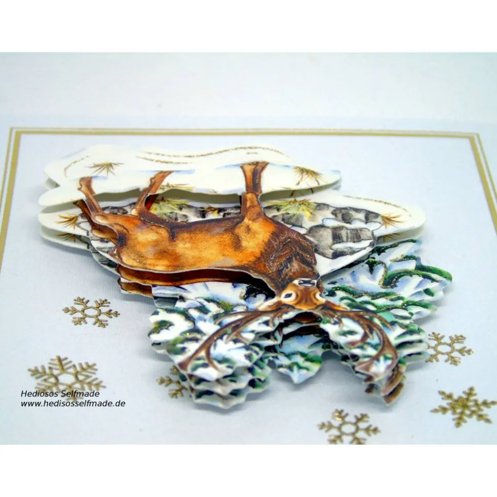 Das Motiv eines Hirsches in einem verschneiten Winterwald vor leise fallenden goldenen Schneeflocken wurde in 3-D-Optik aufgebracht.
