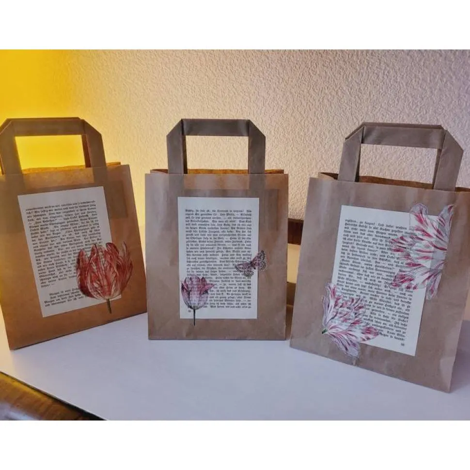 auf der Vorderseite sind sie liebevoll mit einer ausgelesenen Buchseite und floralem Motiv in Serviettentechnik verziert …