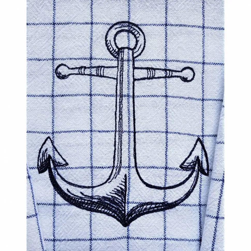 Die Tücher sind blau weis und mit einem Compass, Anker und einem Steuerrad in dunkelblau bestickt.