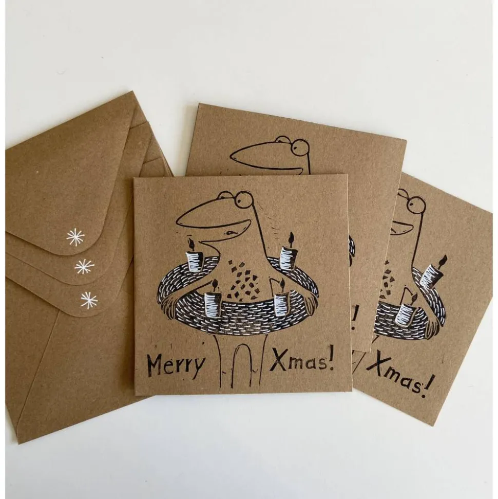 Diese Angebot beinhaltet 3 handgedruckte Weihnachts-Klappkarten sus Kraftpapier, 13 x 13 cm groß, sowie 3 passende Umschläge, ebenfalls bedruckt.