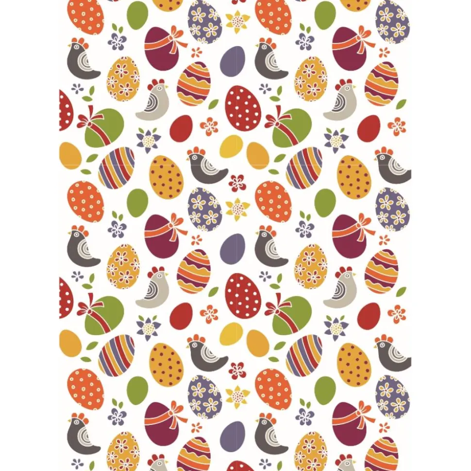 Osterkarten Hühnern, Blumen und bunt verzierten Ostereiern.