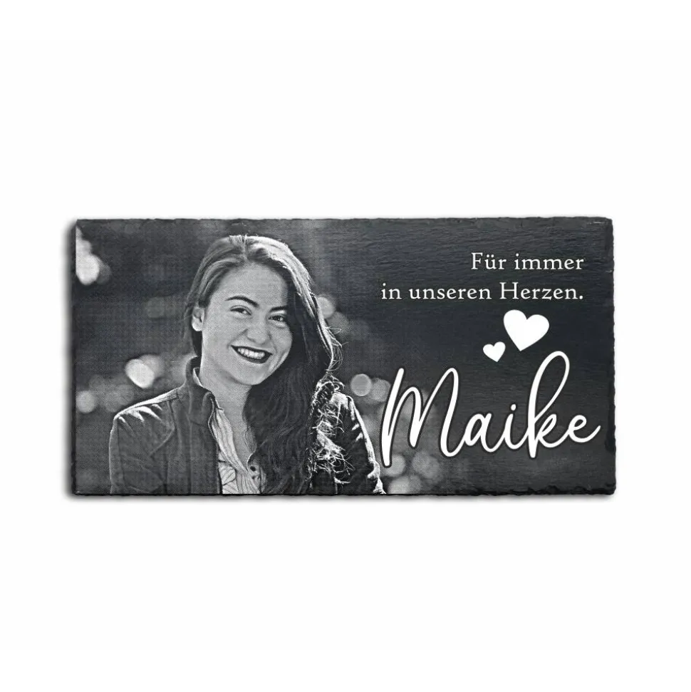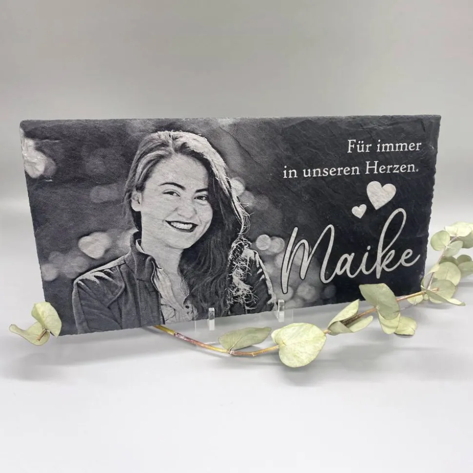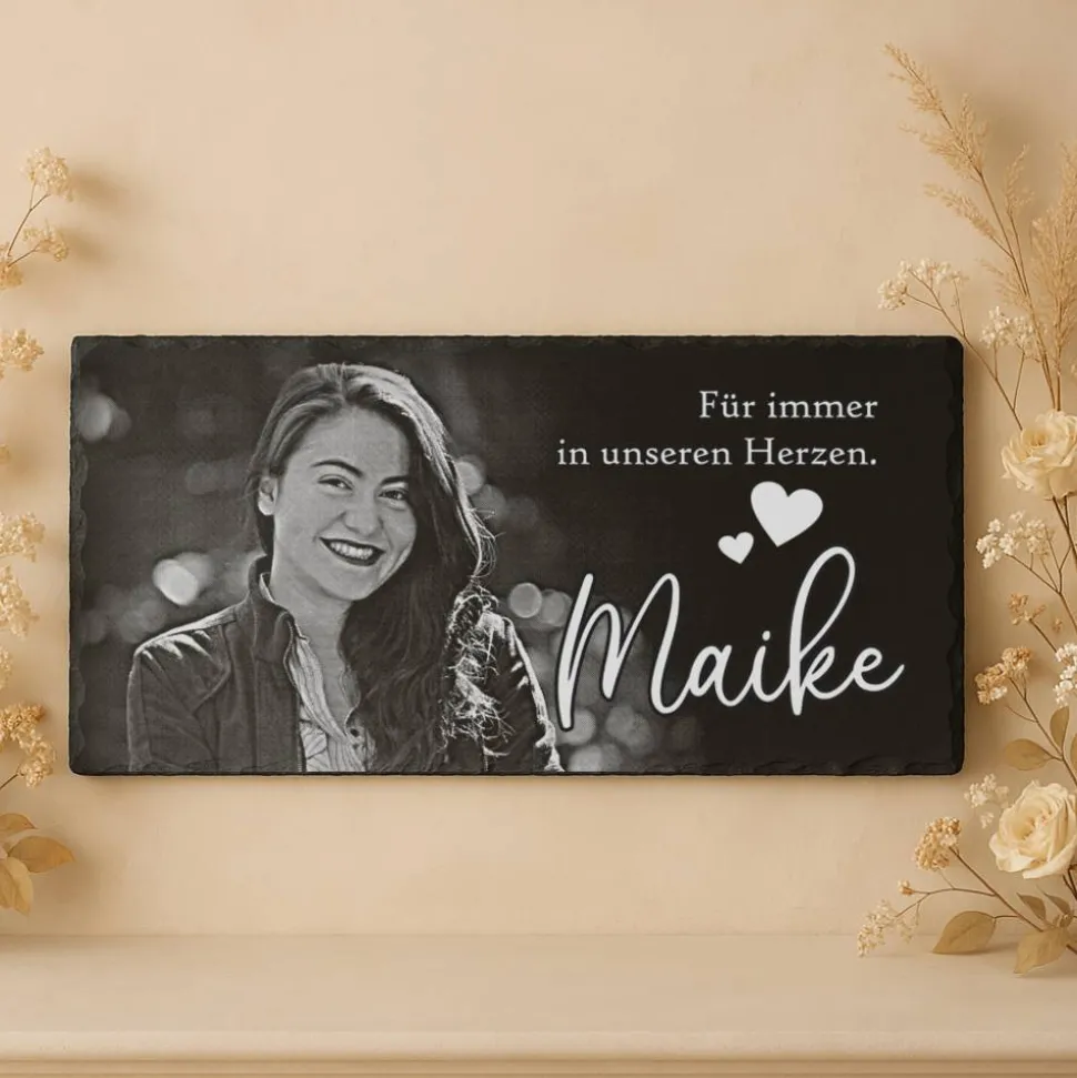 Schaffe eine bleibende Erinnerung mit einem individuellen Gedenkstein: Die 30 x 15 cm Schiefertafel inkl. Gravur ist die perfekte Wahl als persönlicher Grabschmuck. Jede Gedenktafel wird nach deinen Wünschen graviert – mit Foto, Wunschtext und auf Wunsch kleinen Symbolen. So gestaltest du eine einzigartige Grabtafel, die liebevoll an einen besonderen Menschen erinnert.