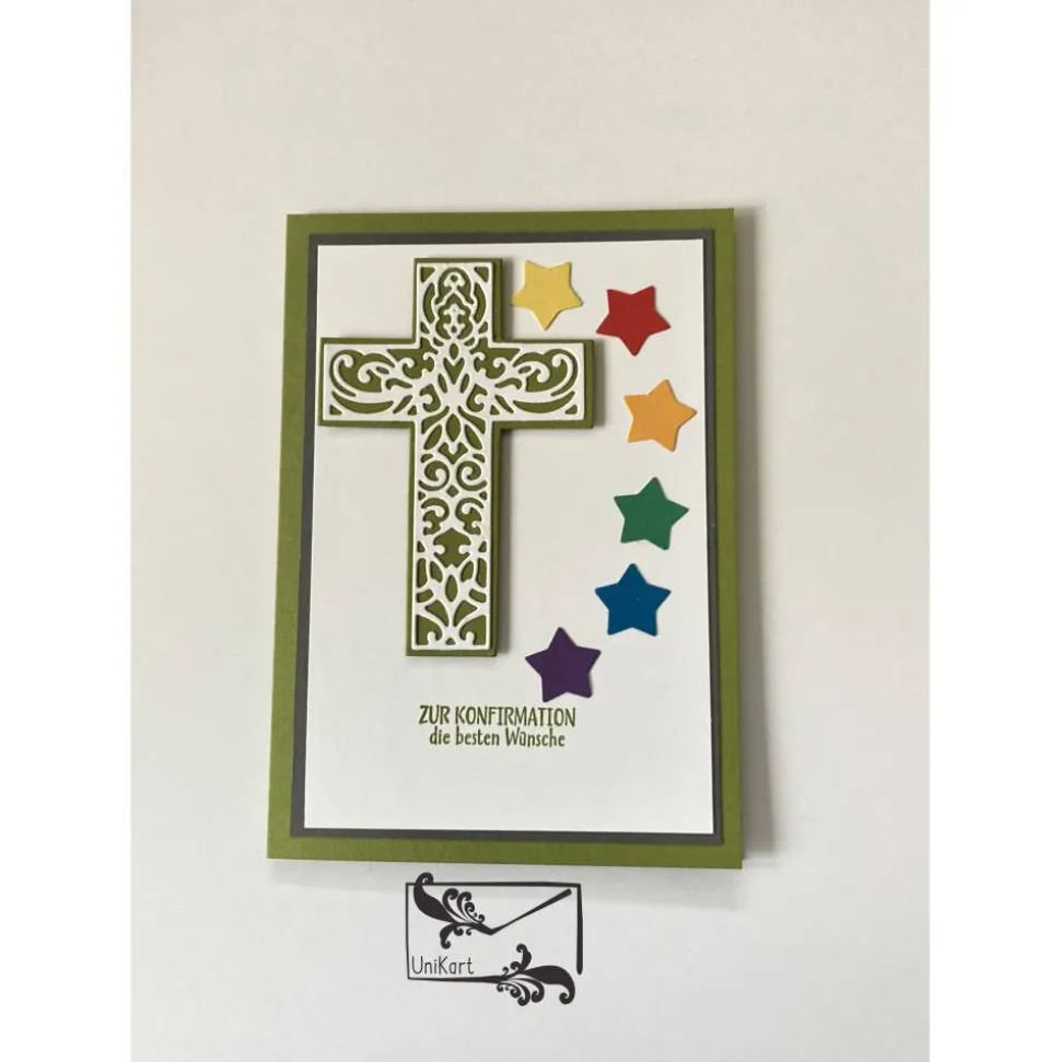 Das Kreuz ist auf Abstandshalter gesetzt, sodass ein 3D Effekt entstanden ist. Im Karteninnern ist ein Einlegeblatt für persönliche Glückwünsche an die/den Konfirmanden.