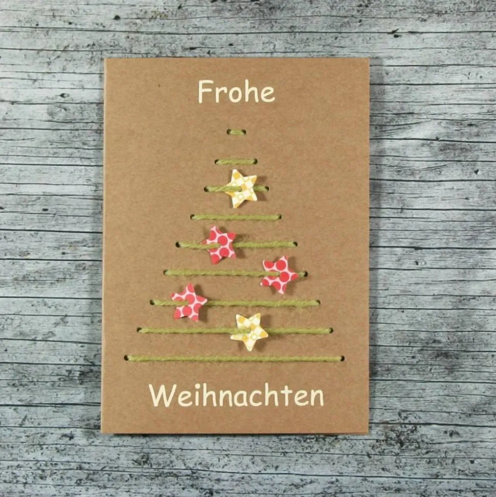 Karte: Kraftpapier 244 gr, Klebefolie, Einlegeblatt: 80 gr, Sterne: Designkarton 300 gr, Stickwolle, Kuvert,