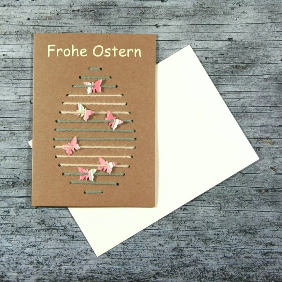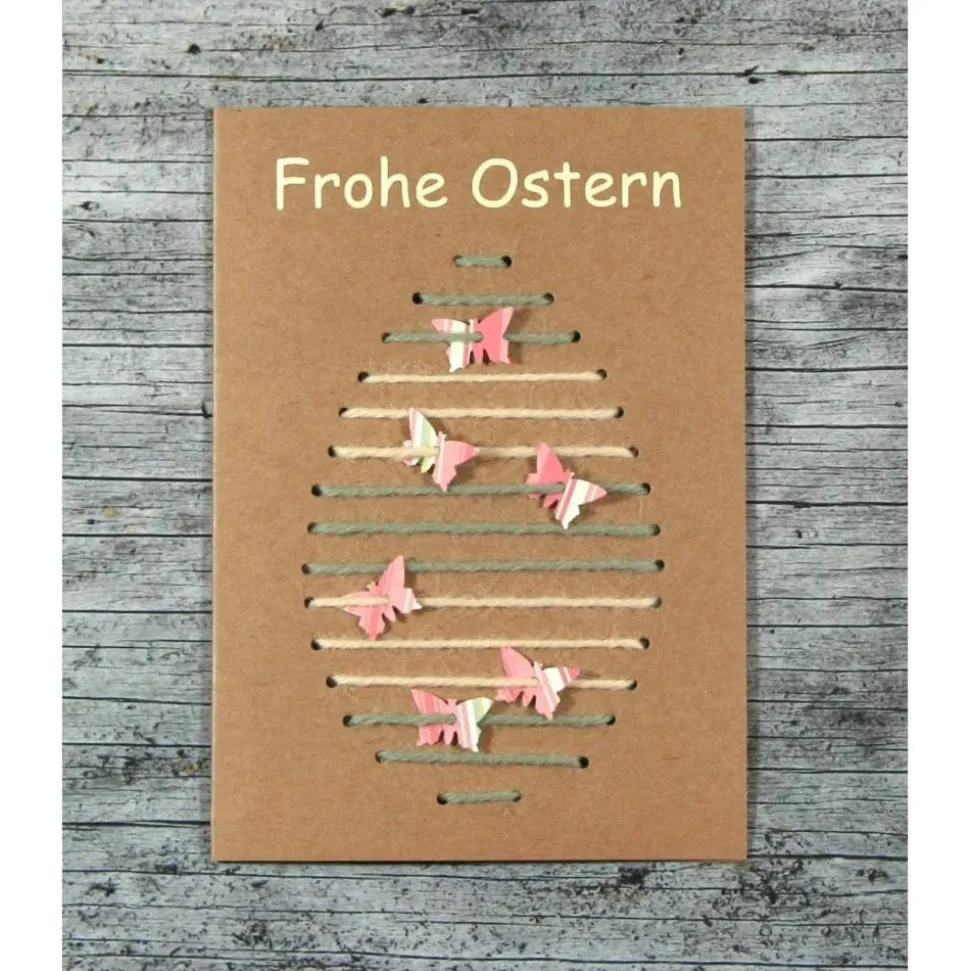 Kraftpapierkarte Din A6 mit Folienveredelung, Bestickung und aufgefädelten Schmetterlingen aus Designkarton, Kuvert und Einlegeblatt