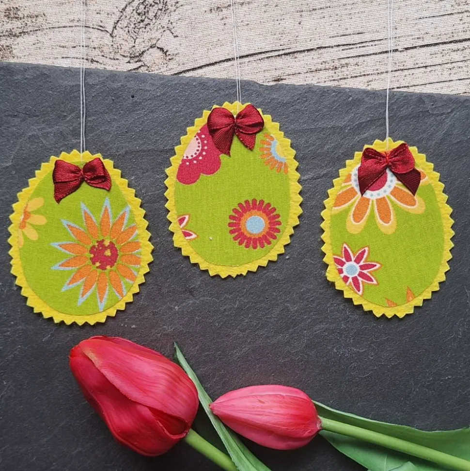 Die Ostereier wurden aus Baumwollstoff und Filz hergestellt und mit einem Schleifchen versehen.