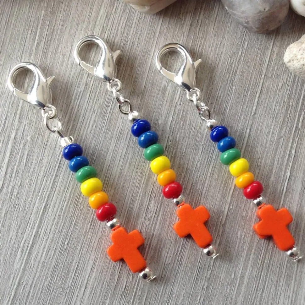 Ein orangefarbenes Howlithkreuz ( 8mm breit & 10 mm hoch ) Metallperlen und bunte Rocailles ( Durchmesser 4,5mm ) sind auf einem Nietstift aufgereiht. Dieser ist mit einer Öse an dem dunkelsilbernen Karabiner ( ca 1,4 cm hoch ) befestigt. Die Gesamtlänge beträgt ca 5,6 cm.