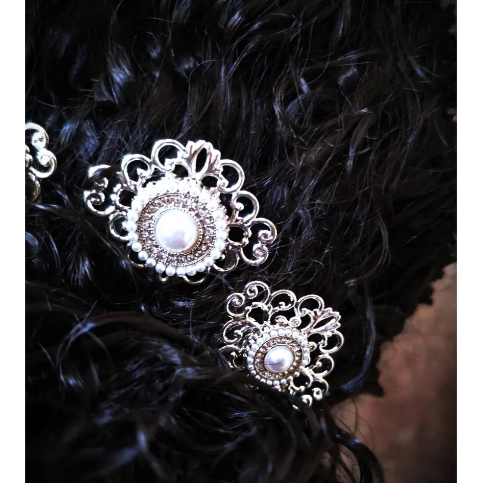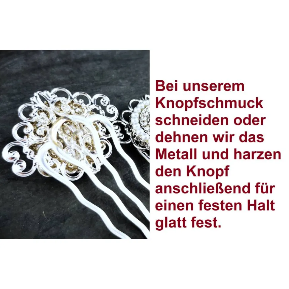 Die Haarkämme sind mit Strassknöpfen in unterschiedlichen Größen verziert und mit Harz versiegelt.