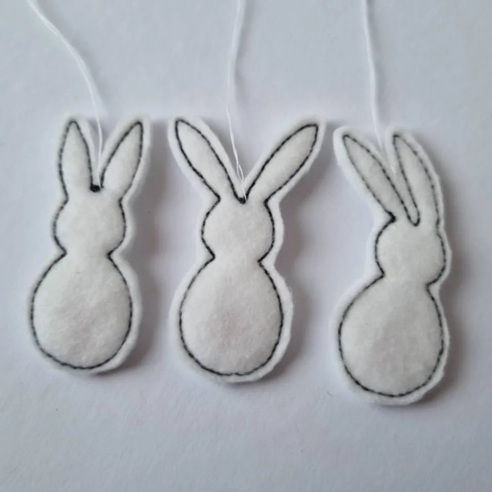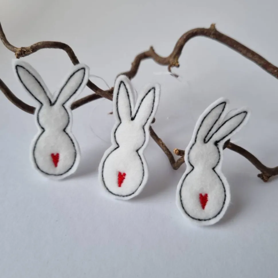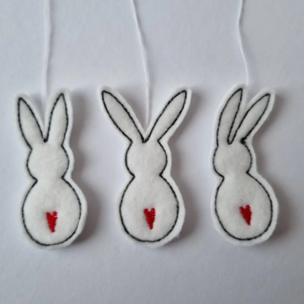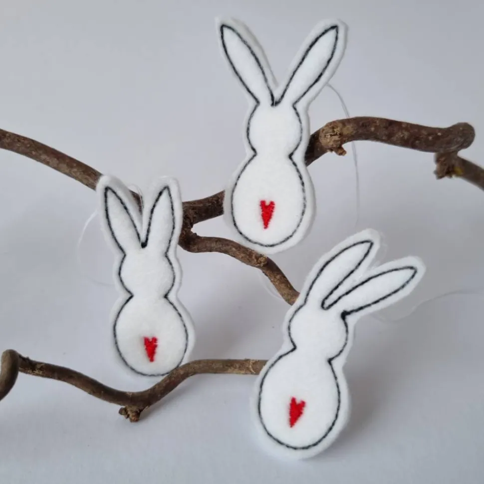 Die Häschen wurden aus doppeltem, ca. 1 mm dickem Filz, mit der Stickmaschine hergestellt (ITH) und mit einem dünnen Nähgarn zum Aufhängen versehen – fast unsichtbar.
