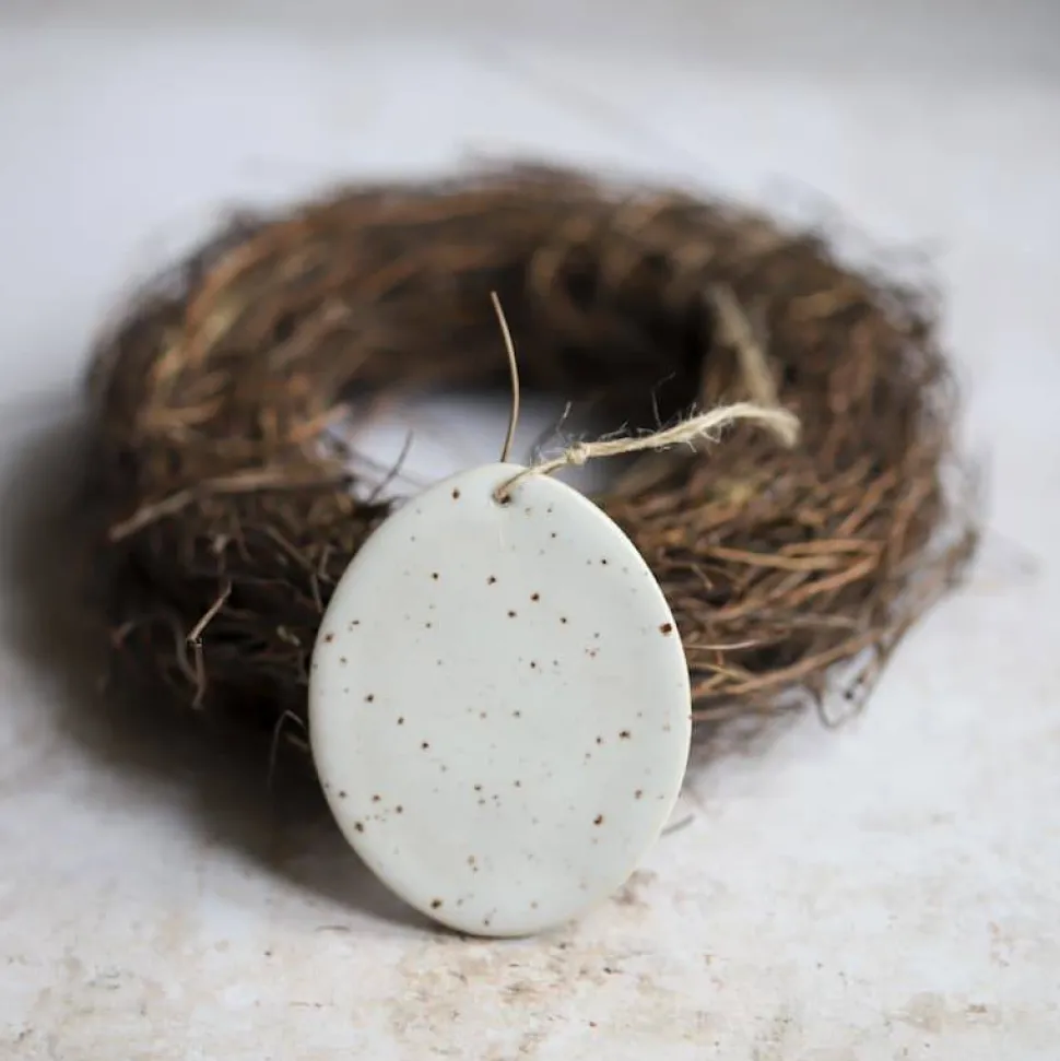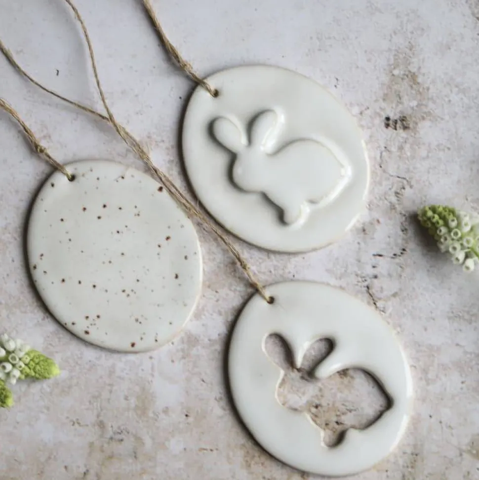 Die Anhänger sind handgetöpfert und mit weißer/ weiß-gesprenkelter Glasur glasiert. Sie kommen im Set von 3 Anhängern.