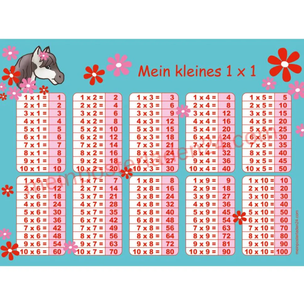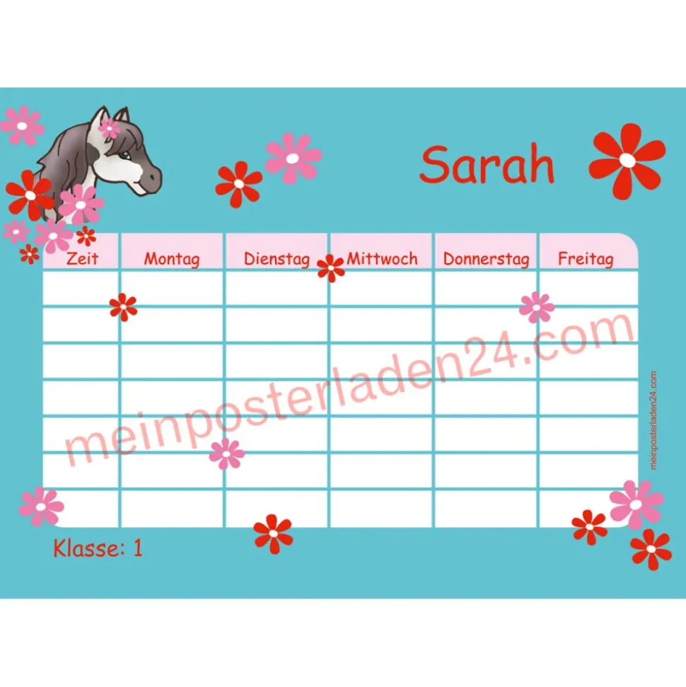 4 er Set  A4 Stundenplan + Lernposter + Heftaufkleber  | Pony Blumen – türkis rot