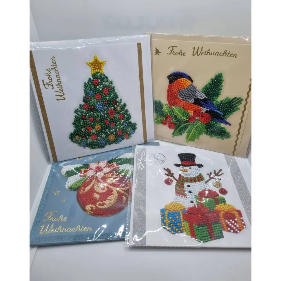 Entdecke ein exklusives 4er Set handgearbeiteter Weihnachtsgrußkarten mit funkelnden Diamond Painting Motiven!