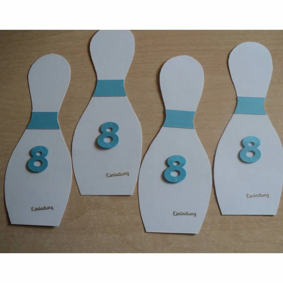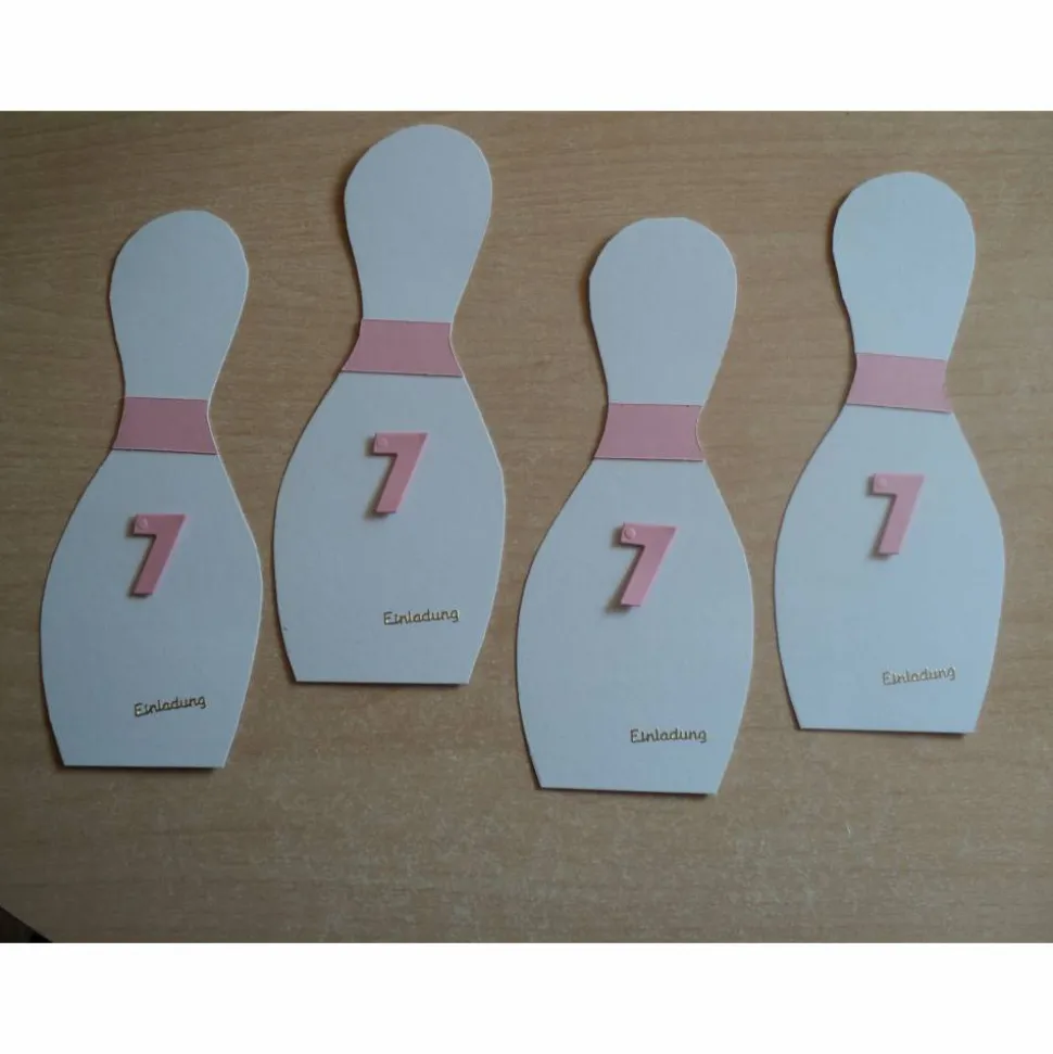 Hier seht ihr ein Set von 4 schönen Einladungskarten zum Kindergeburtstag für einen netten Tag beim Kegeln für ein Mädchen oder Jungen