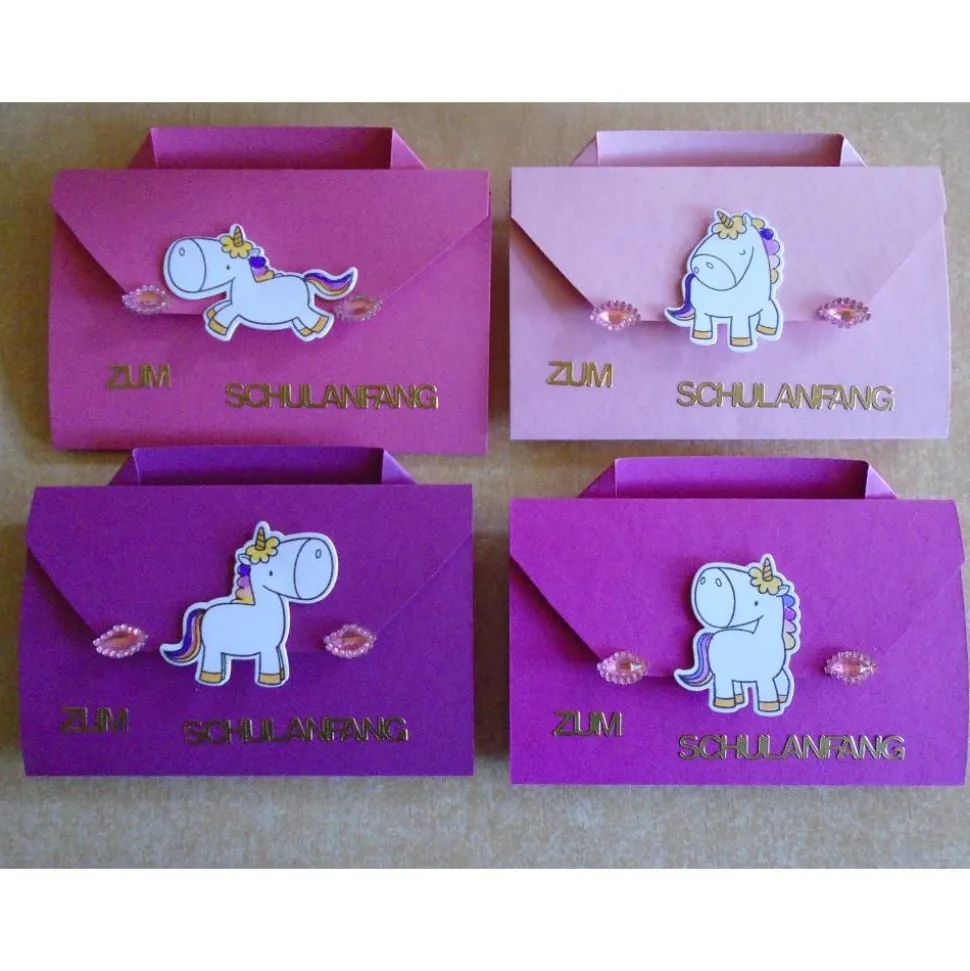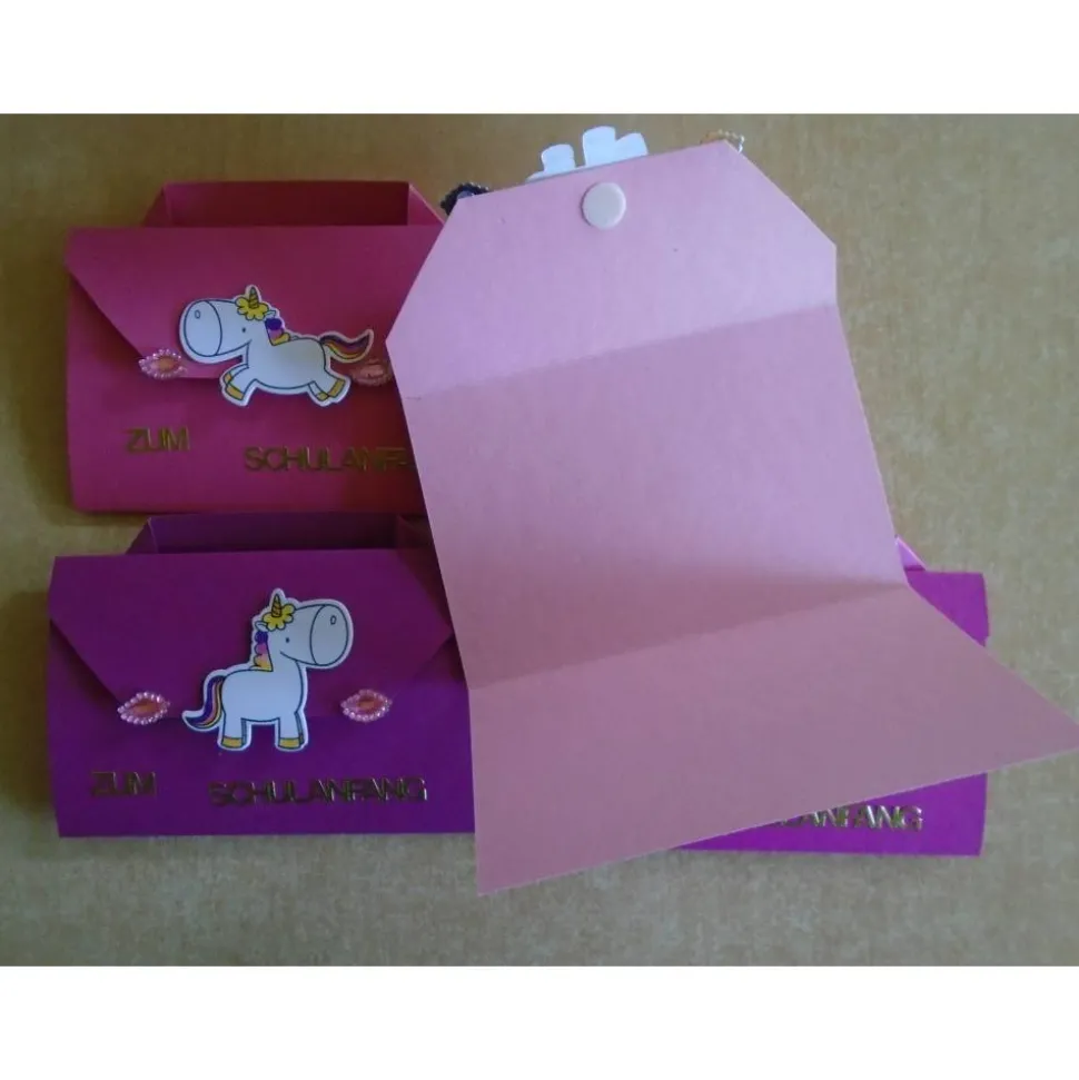 verziert wurden diese Schulanfang/Einschulung Karten mit 3d Motiv,stickern Perlen Einhorn,Stanzer,Stempel,..