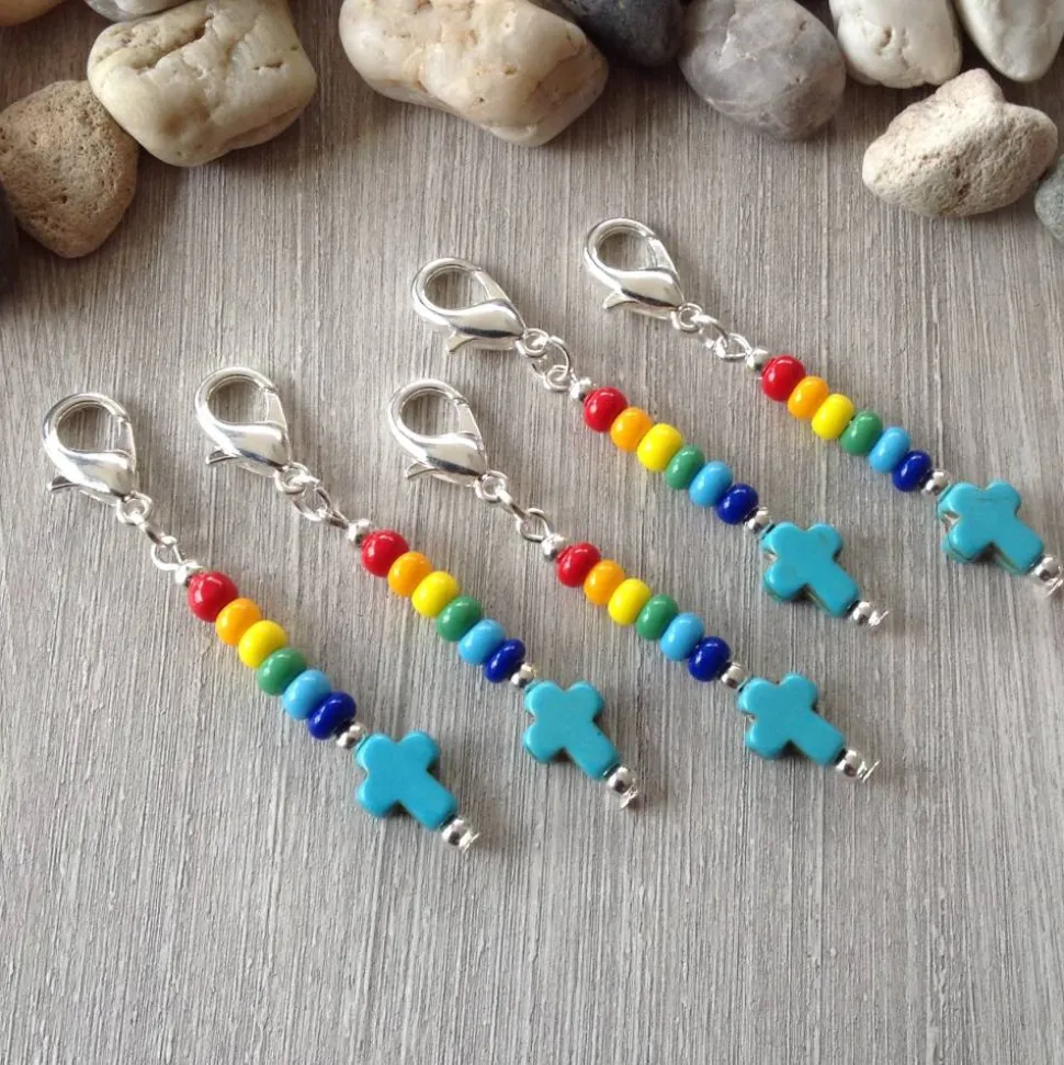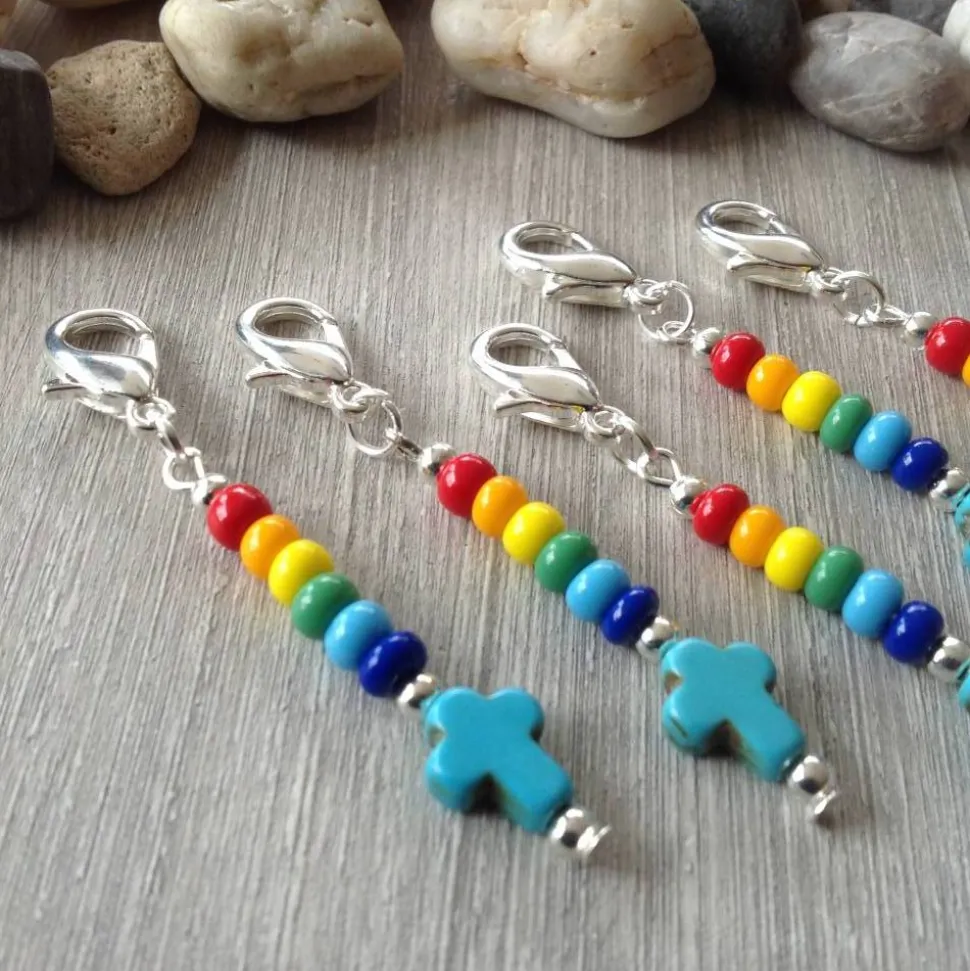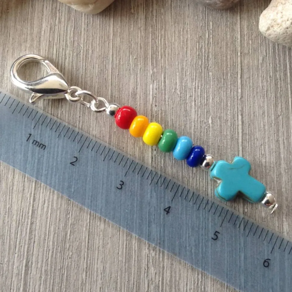 Ein türkisfarbenes Howlithkreuz ( 8mm breit & 10 mm hoch ) Metallperlen und bunte Rocailles ( Durchmesser 4,5mm ) sind auf einem Nietstift aufgereiht. Dieser ist mit einer Öse an dem dunkelsilbernen Karabiner ( ca 1,4 cm hoch ) befestigt. Die Gesamtlänge beträgt ca 5,6 cm.