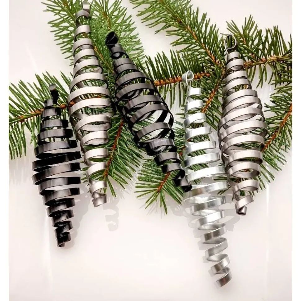 Die Zapfen sind ca. 13-15 cm lang und ca. 3 cm im Durchmesser, an der breitesten Stelle. Das Set besteht aus 5 Zapfen in abgestimmter Farbkombination: Schwarz, Silber, Anthrazit.