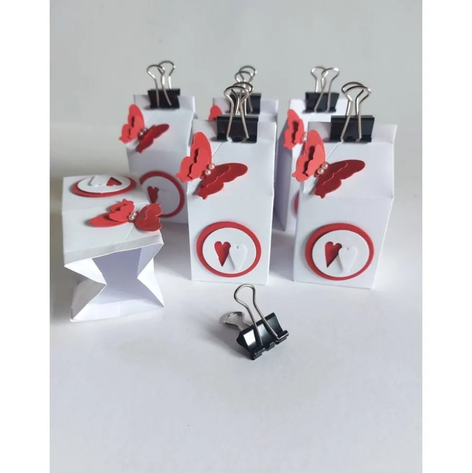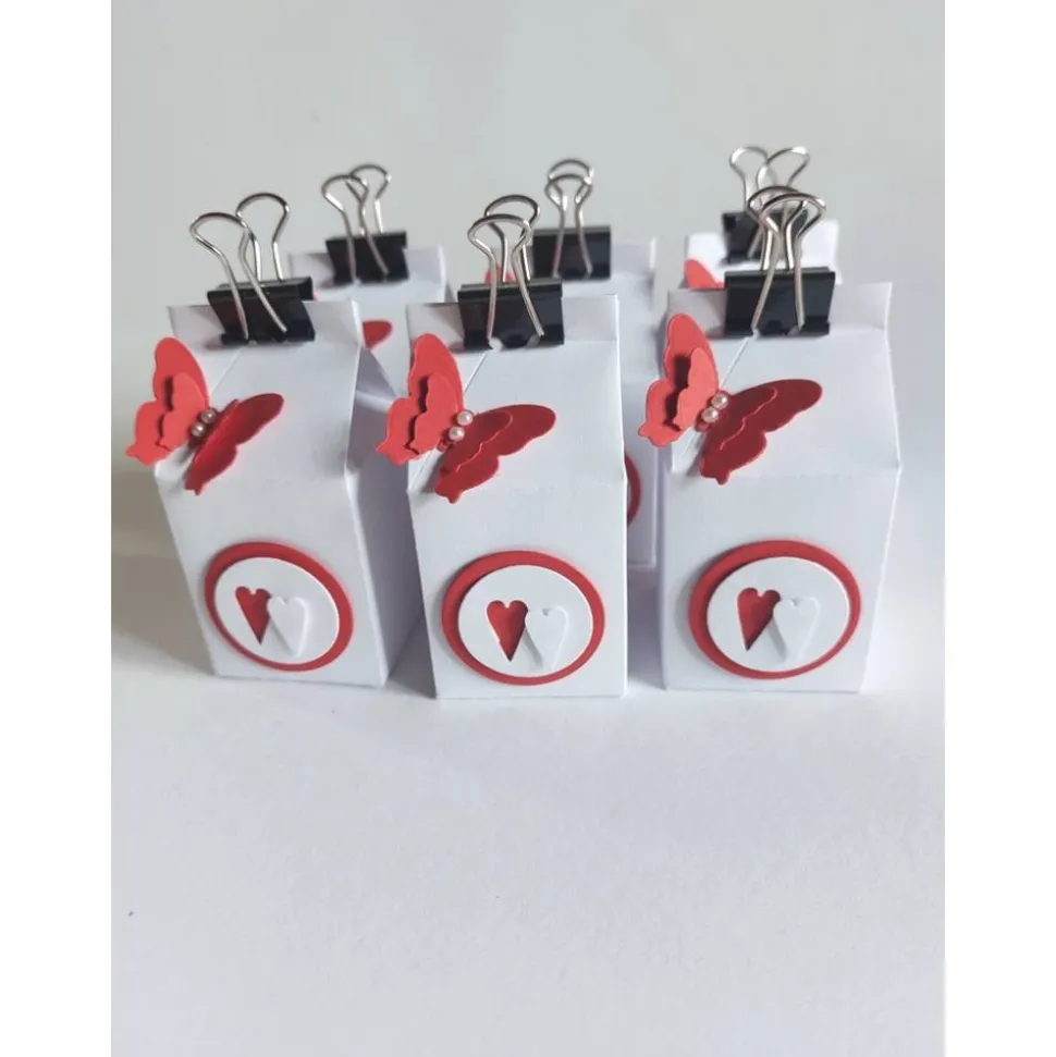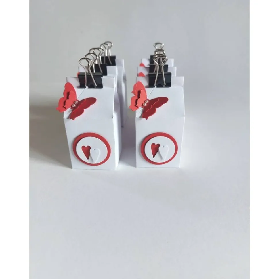 Kleine Milchtüte in weiß/rot dekoriert mit Schmetterling, Herzen und Halbperle. Zum selbst befüllen mit Hochzeitsmandeln, Süßigkeiten, kleinen Seifen etc., verwendbar als Gastgeschenk. Mit Namensanhänger kann sie auch als Tischkarte fungieren.