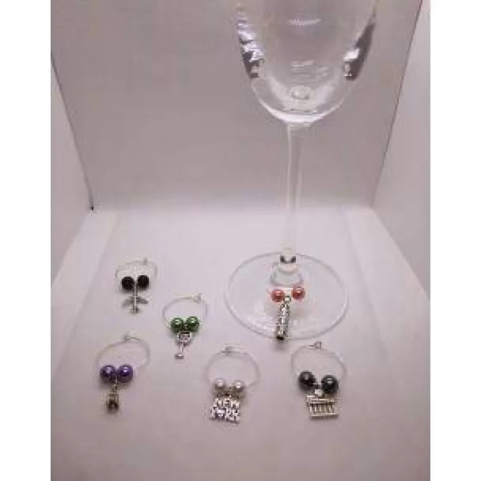6 verschließbare Markierungsringe die mit bunten Glaswachsperlen bestückt sind und jeweils einen Anhänger „Reisemotive“ in der Mitte haben. Die Ringe können um jedes Stielglas gelegt werden.