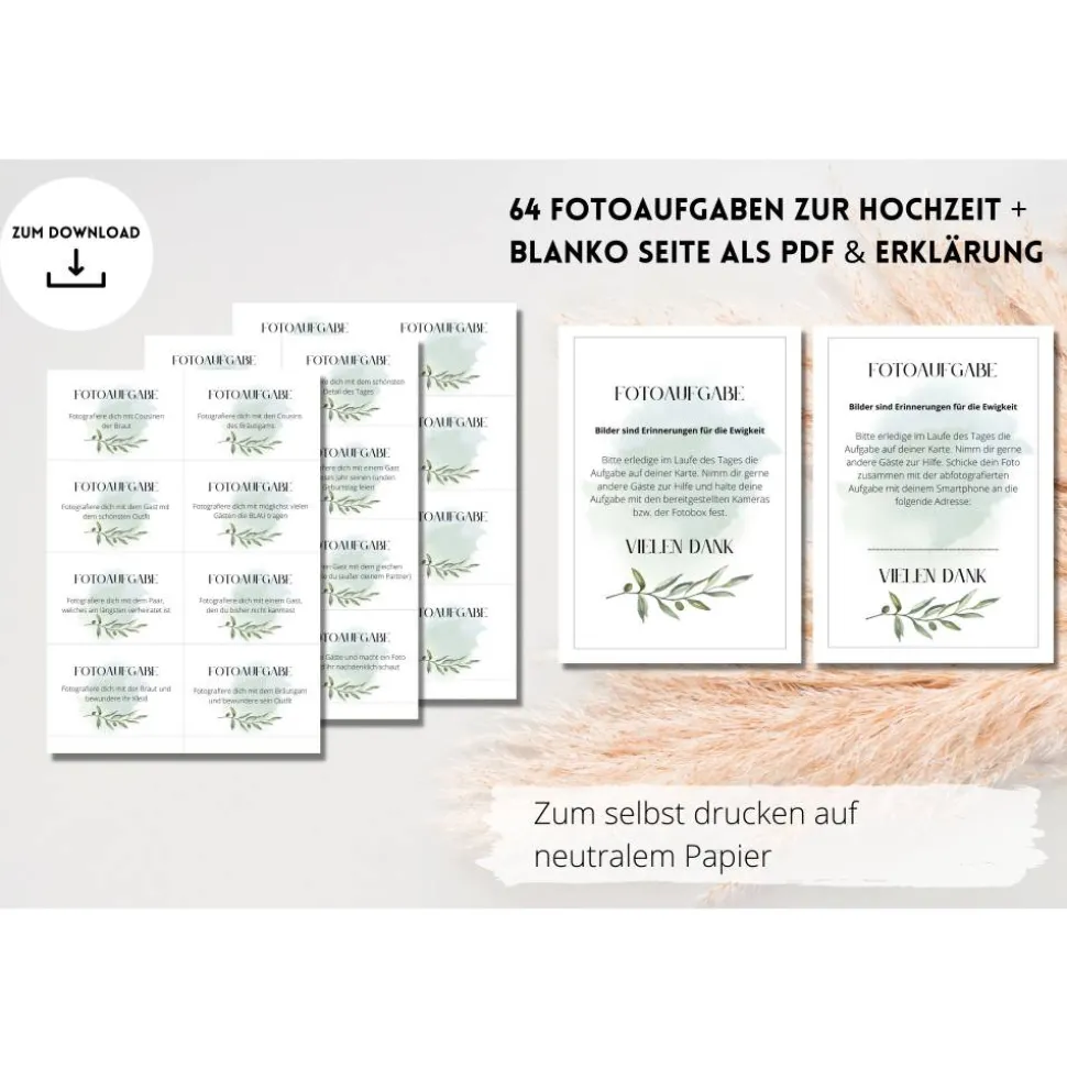 Du planst gerade deine Hochzeit oder du möchtest eine Überraschung für das Brautpaar vorbereiten? Mit dieser PDF Vorlage hast du ganz schnell tolle Karten für Fotoaufgaben bzw. ein Fotospiel basteln. Einfach auf dickem weißen Papier oder auch Kraftpapier / bunten Papier ausdrucken, schneiden und FERTIG !!!