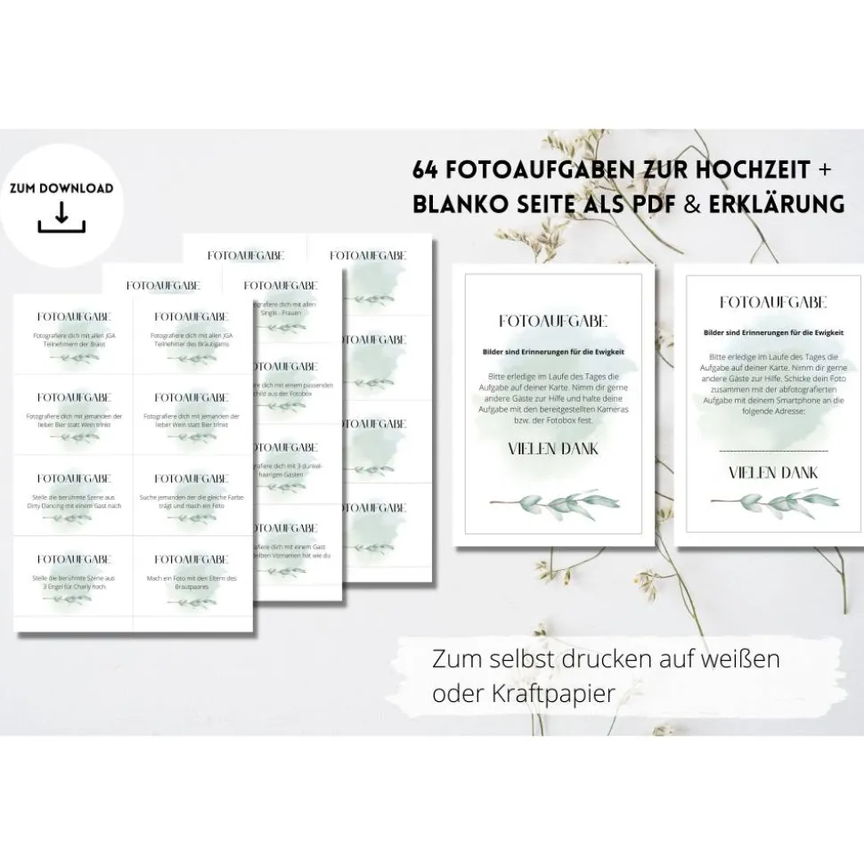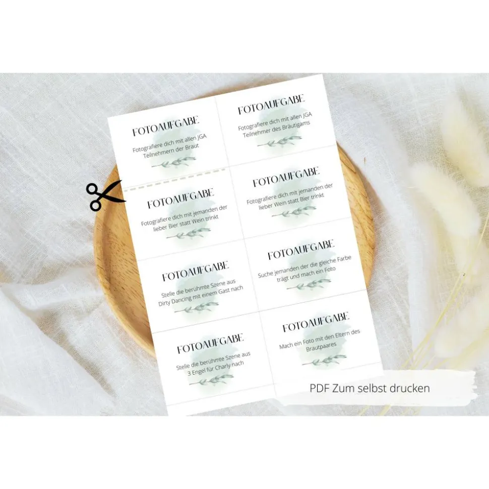 Du planst gerade deine Hochzeit oder du möchtest eine Überraschung für das Brautpaar vorbereiten? Mit dieser PDF Vorlage hast du ganz schnell tolle Karten für Fotoaufgaben bzw. ein Fotospiel basteln. Einfach auf dickem weißen Papier oder auch Kraftpapier / bunten Papier ausdrucken, schneiden und FERTIG !!!