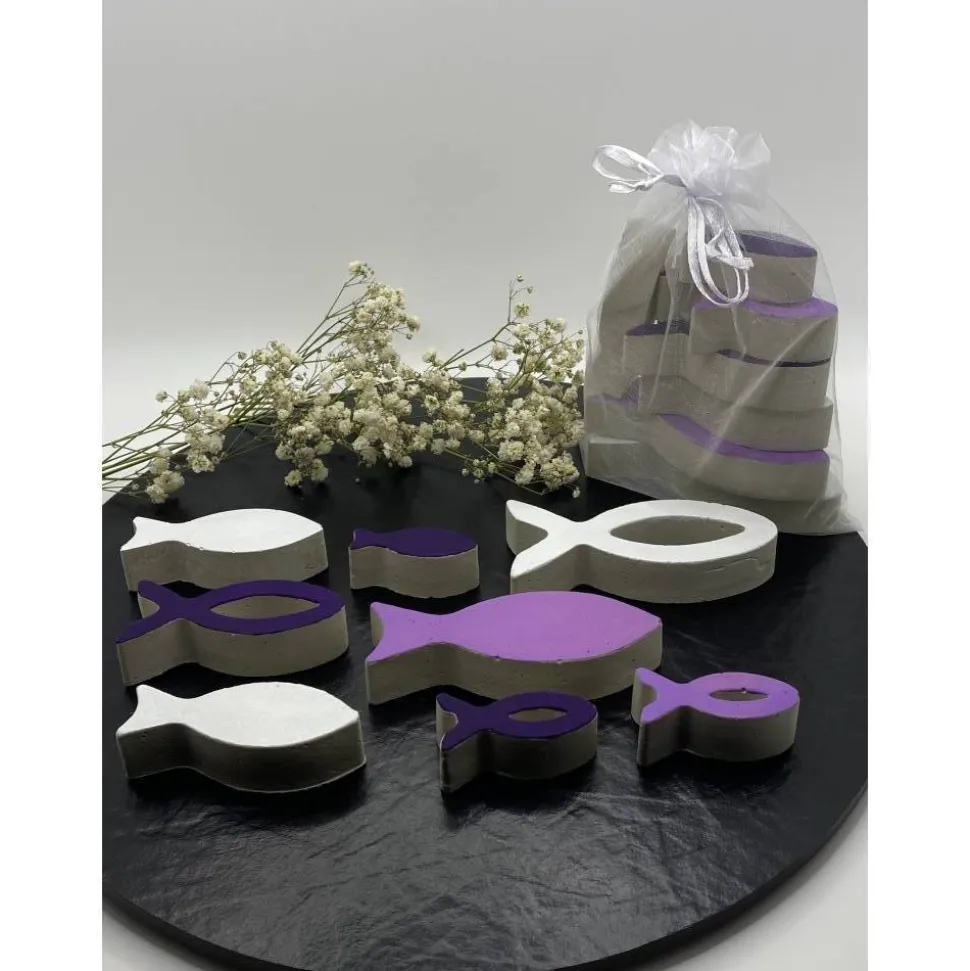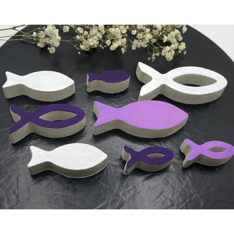 Set besteht aus 8 Fischen die aus Naturbeton bestehen und Handbemalt sind. Sie können beschriftet werden.