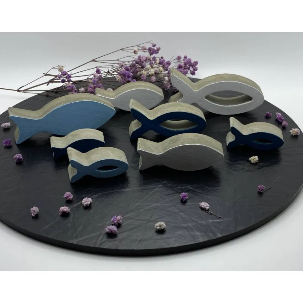 Set besteht aus 8 Fischen die aus Naturbeton bestehen und Handbemalt sind. Sie können beschriftet werden.
