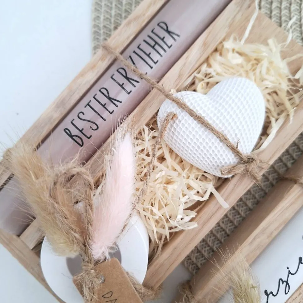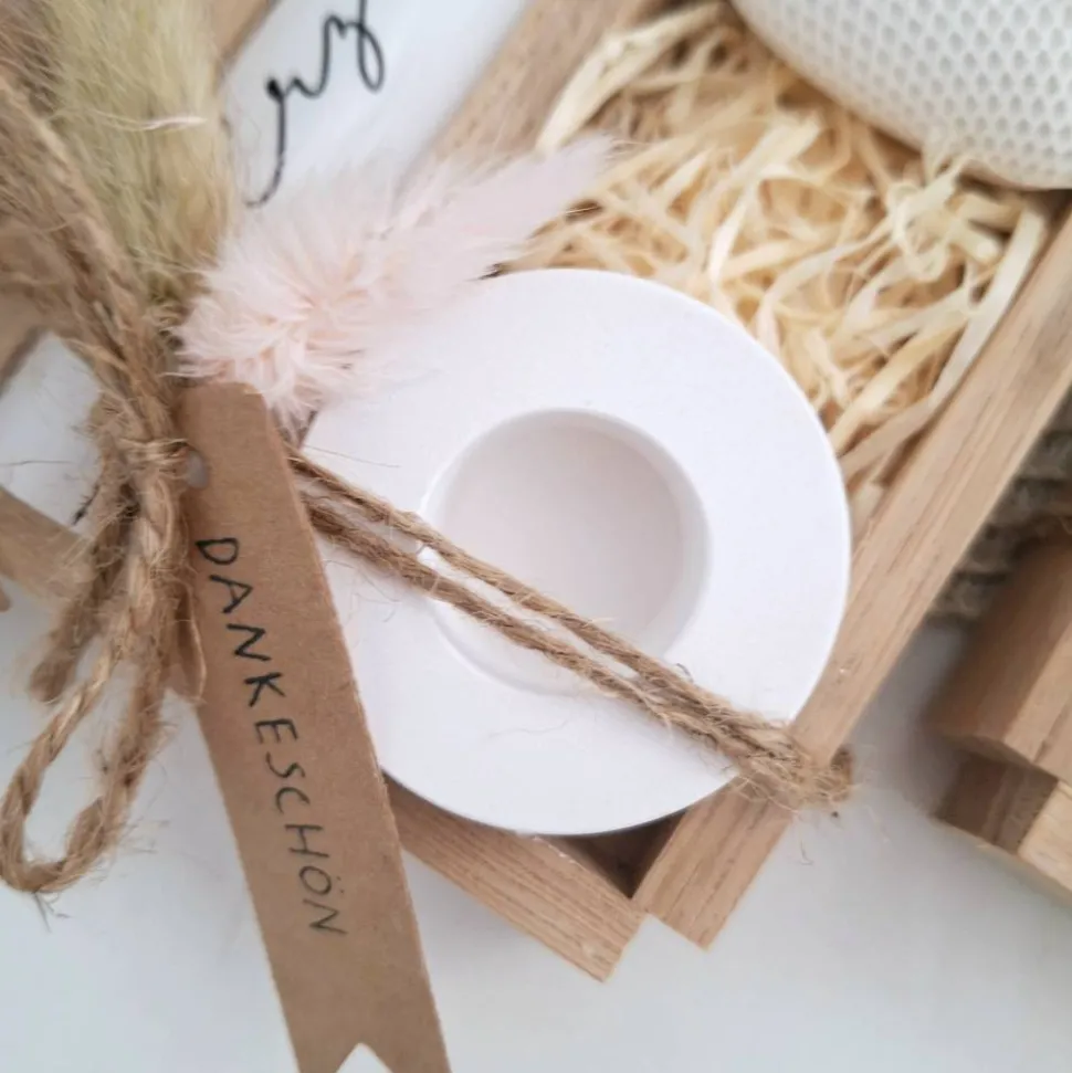 Das Geschenkset wird in einer Holzbox zusammengebunden, mit Trockenblumen (können variieren) verziert und mit einem Anhänger “ DANKESCHÖN “ ergänzt.