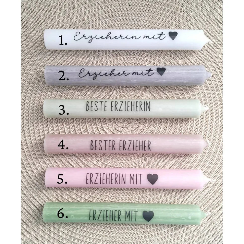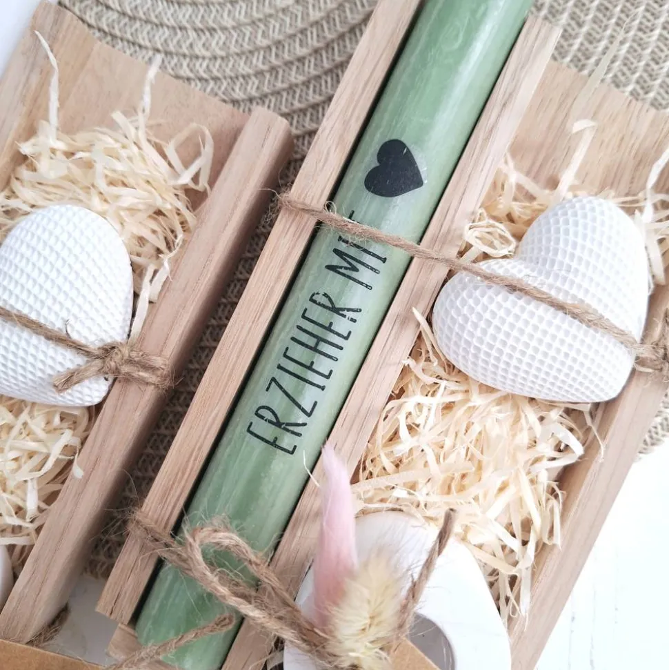 Das Kerzenset besteht aus einer Kerze (in der Farbe deiner Wahl) mit einer Aufschrift deiner Wahl, einem passenden runden Kerzenhalter und einem Dekoherz.