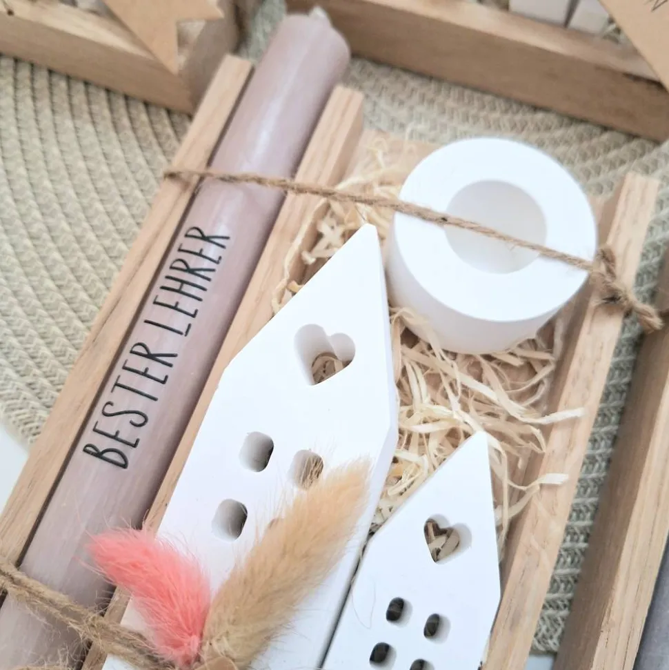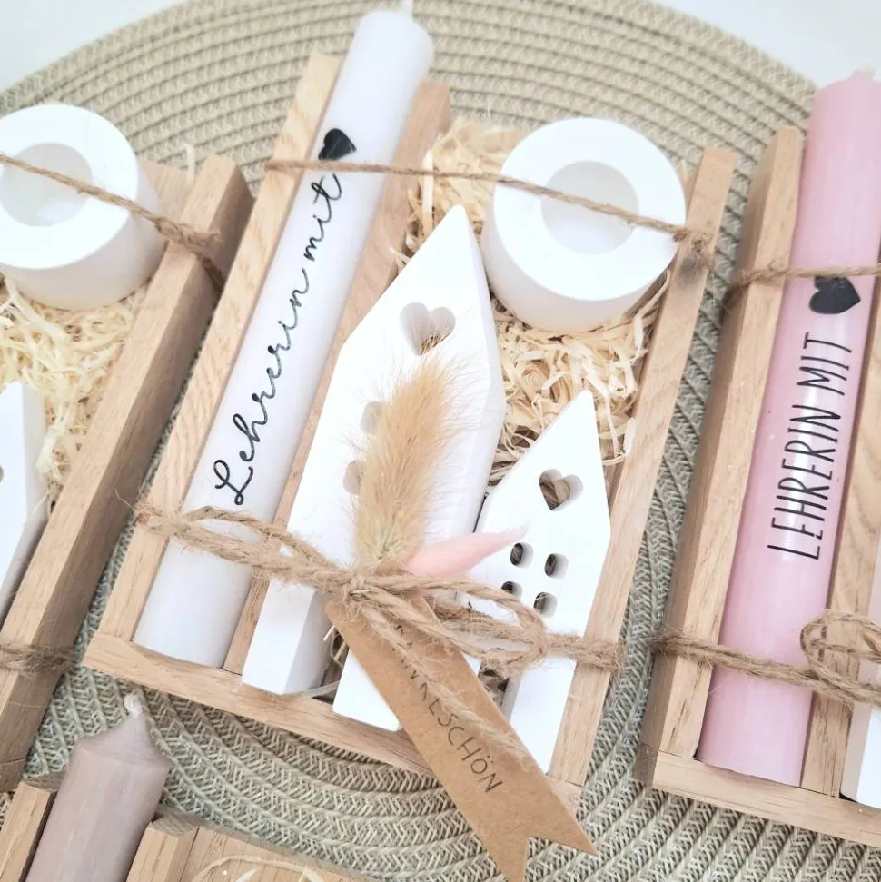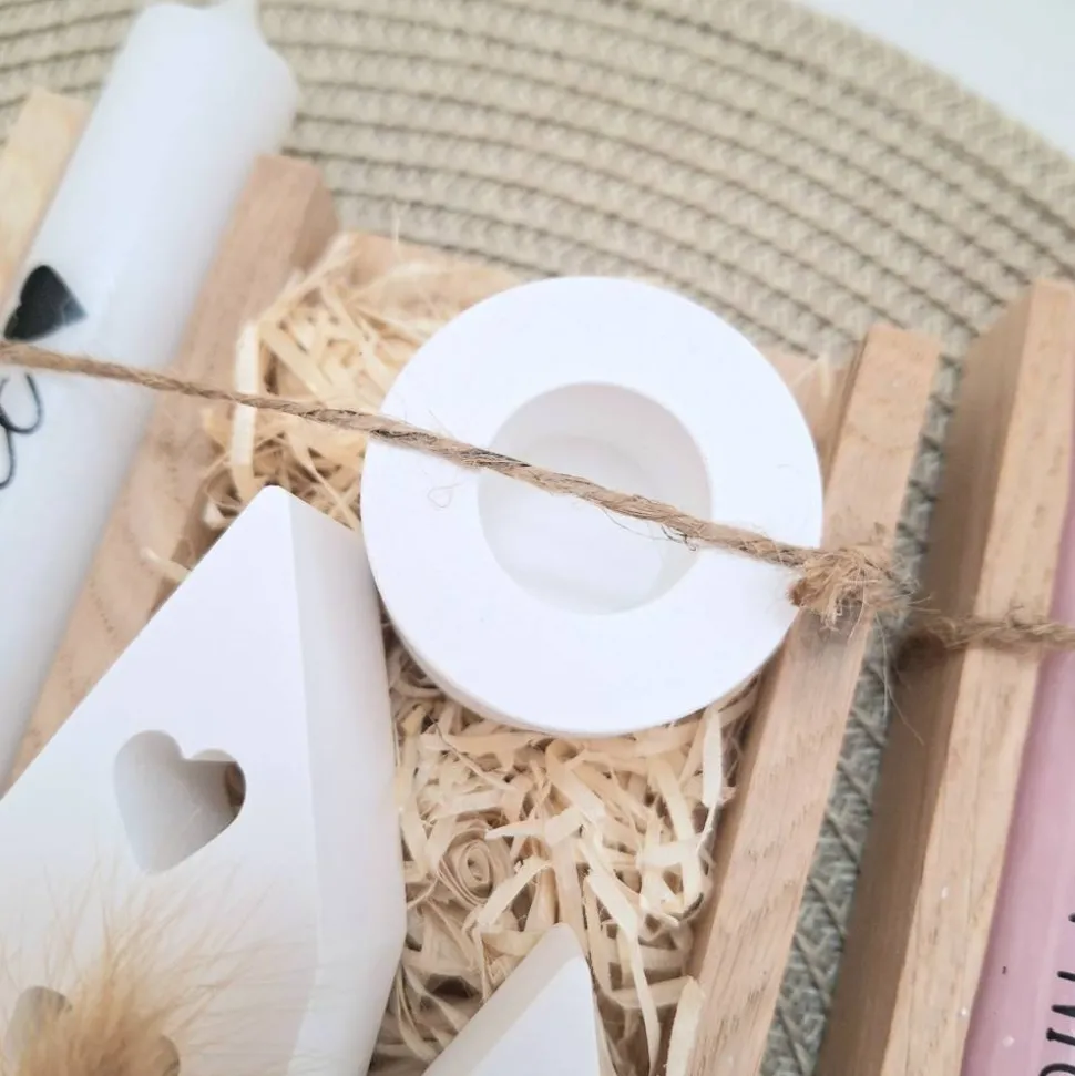 Das Kerzenset besteht aus einer Kerze (in der Farbe deiner Wahl) mit einer Aufschrift deiner Wahl, einem passenden runden Kerzenhalter und zwei Häuser / Lichthäuser.
