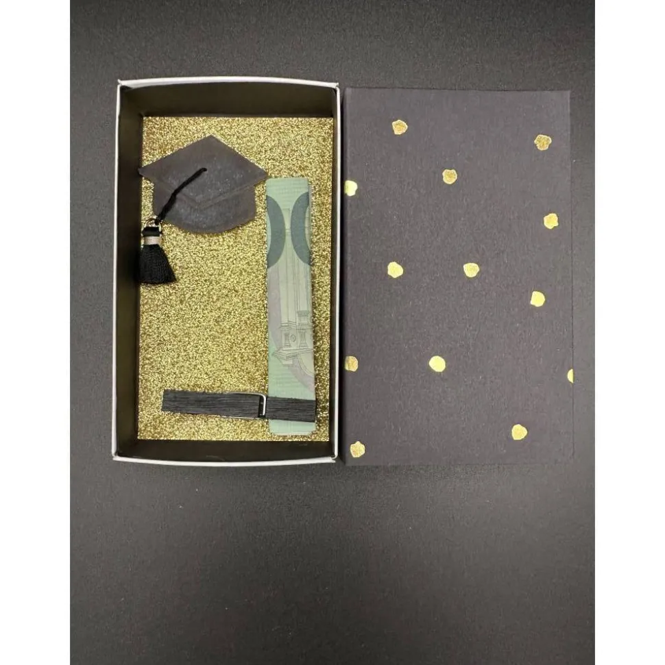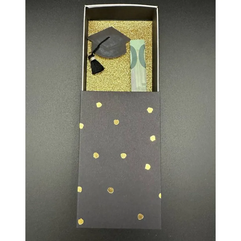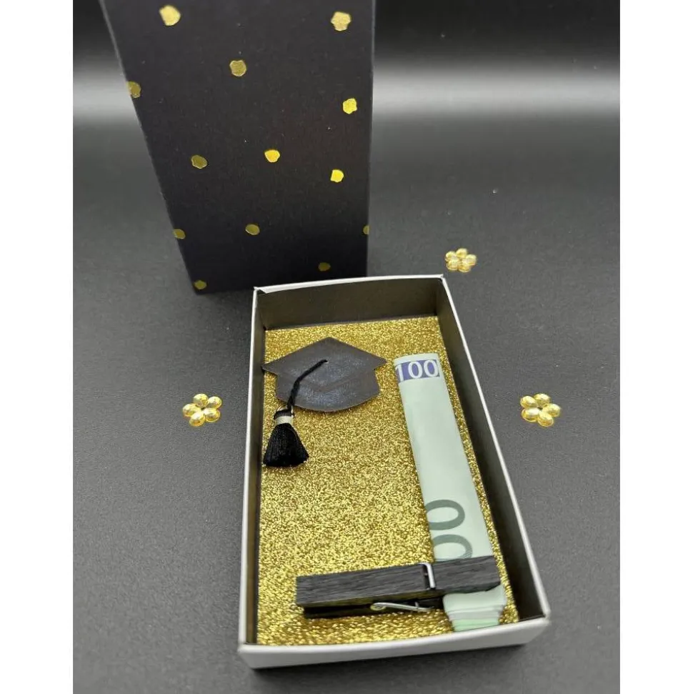 In der hochwertigen Schiebebox verpackst du dein Geldgeschenk stilvoll und kreativ. Die Box ist innen mit schwarzem Papier ausgekleidet und mit goldenem Glitzerpapier veredelt. Ein handgemalter Abschluss-Hut mit schwarzer Quaste macht die Geschenkbox zu einem echten Hingucker. Mithilfe der schwarzen Klammer in der Box kannst du den Geldschein sicher befestigen.